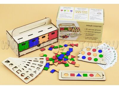 - Набор «Умный сундучок». Чудеса хранятся не только в большом мешке Деда Мороза, но и в этой игре. Многофункциональный набор для логических игр и сортировки. С помощью цветных ящичков и прорезей вверху ребенок научится сортировать по цвету и выучит геометрические фигуры. В каждом ящичке по несколько фишек четырех геометрических форм: круг, квадрат, треугольник, прямоугольник. По цвету фишки соответствуют цвету ящичка. Игра развивает усидчивость, концентрацию, внимательность, мелкую моторику и стимулирует речевые центры.