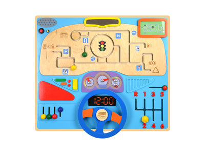 Бизиборд ПДД воплощает заветную детскую мечту побывать на месте водителя авто. Воспитателю остается только поддержать инициативу ребят и организовать поочередное вождение. Учитывая интерес, который вызывает автомобильная панель у детишек, взрослый легко поможет дошкольнику освоить азы вождения и основы ПДД. На бизиборде расположены: руль, имитация коробки передач, приборная панель, лабиринт-схема дорожного движения.