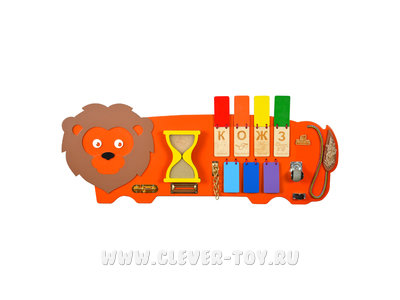 Бизиборд «Лев» - Комплектация: песочные часы, которые можно вращать, чтобы наблюдать за движением песка; шпингалет и дверная цепочка для бесконечных тренировок детских пальчиков; 2 колесика, которые дети крутят и сравнивают (по размеру, расположению); хвостик-шнурок с кисточкой из пушистого ворса для развития сенсорики.