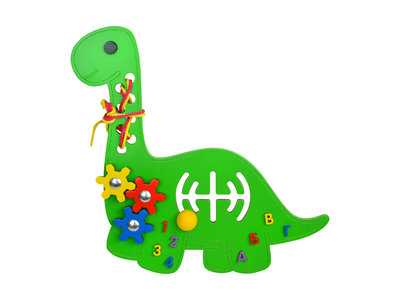 Бизиборд "Динозавр мистер Грин" помогает детям научится выполнять различные бытовые действия (например, завязывать шнурки). В комплектацию входят: шнуровка, разноцветные шестеренки и лабиринт. Размер бизиборда 33х33,5 см.