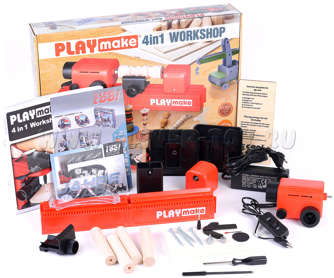 PLAYMAKE - многофункциональный станок по дереву для детей и взрослых. Этот замечательный модульный конструктор-трансформер преобразуется в четыре станка: