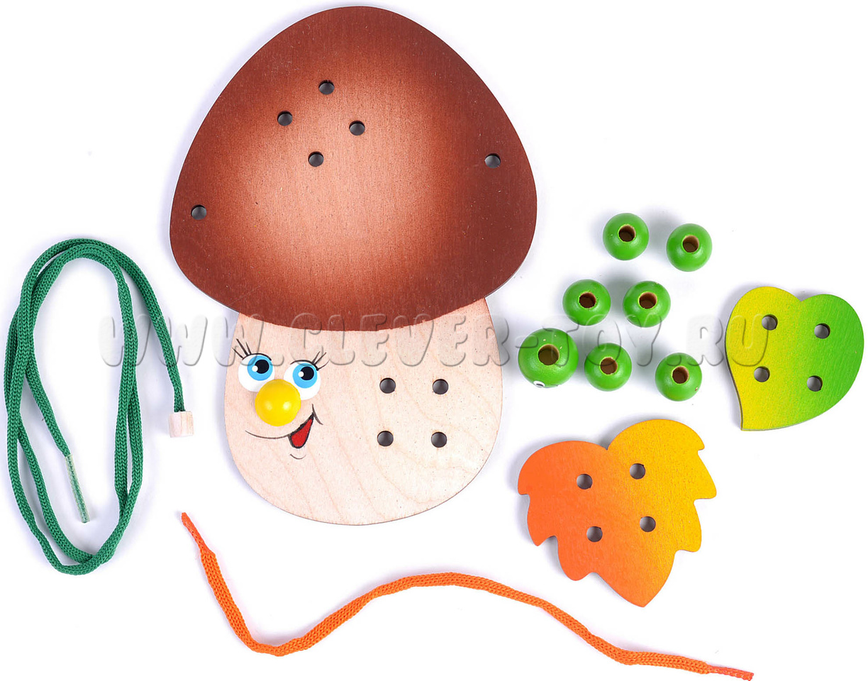 Шнуровка "Гриб Боровик" предназначена для развития мелкой моторики и координации движений в игровой форме. Ребенок узнает, как пришиваются пуговицы и научится делать стежки.