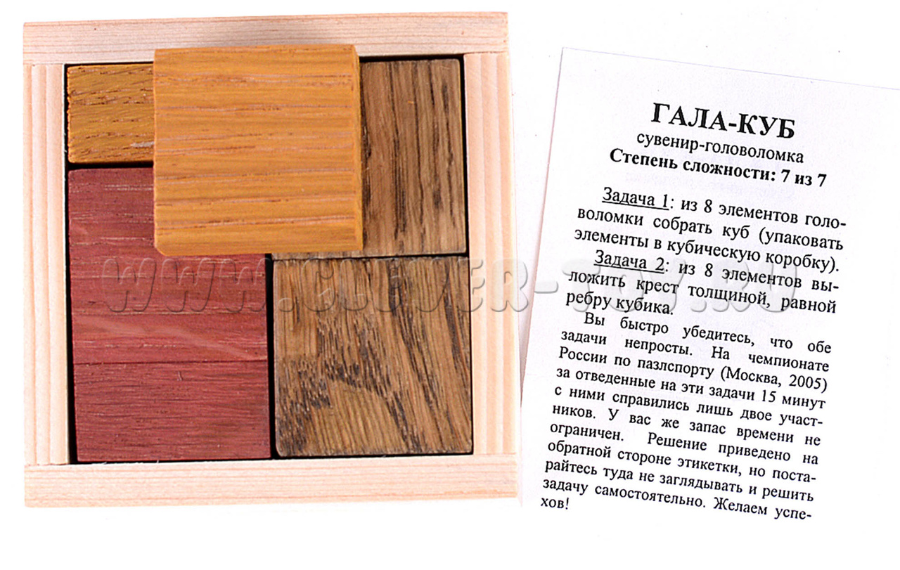Гала куб состоит из 8 элементов и деревянной коробочки. Перед вами стоит две задачи. Сначала – упаковать все 8 элементов внутрь. А затем достать их выложить крест по толщине, равный ребру кубика.