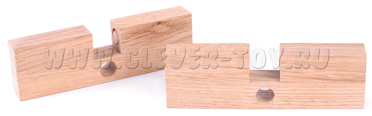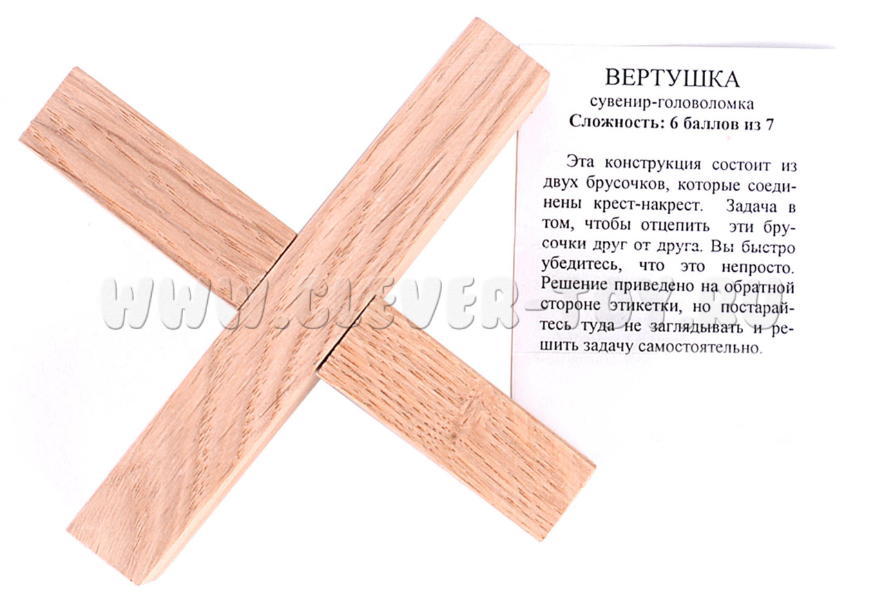 Эта конструкция состоит из двух брусочков, которые соединены крест-накрест. Задача в том, чтобы отцепить эти брусочки друг от друга. Вы быстро убедитесь, что это непросто.