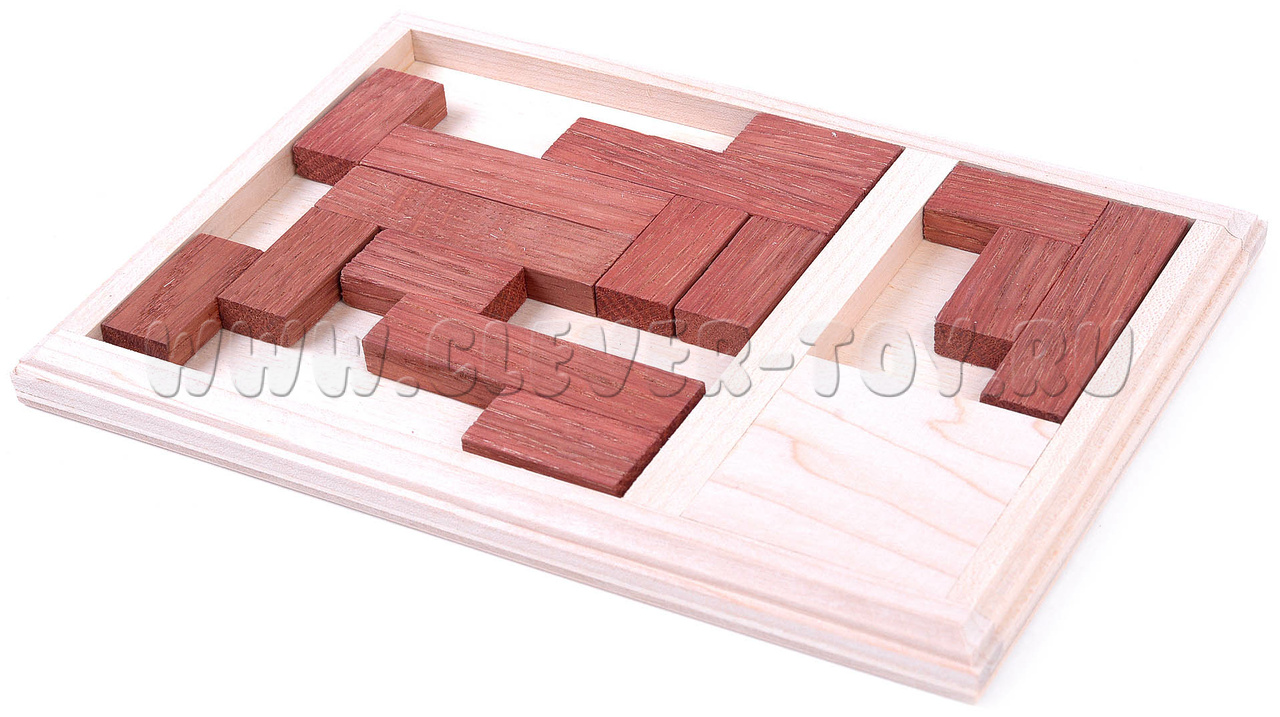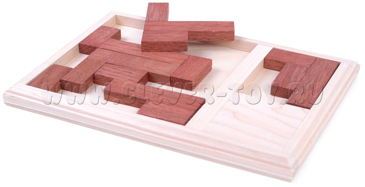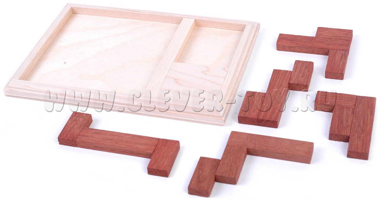 Элементы могут быть повернуты и перевернуты любым образом, однако нельзя накладывать один элемент на другой. Общая площадь всех элементов составляет около 80% площади квадратной ниши в рамке, поэтому места достаточно для размещения всех пяти элементов.