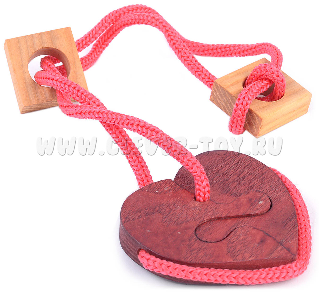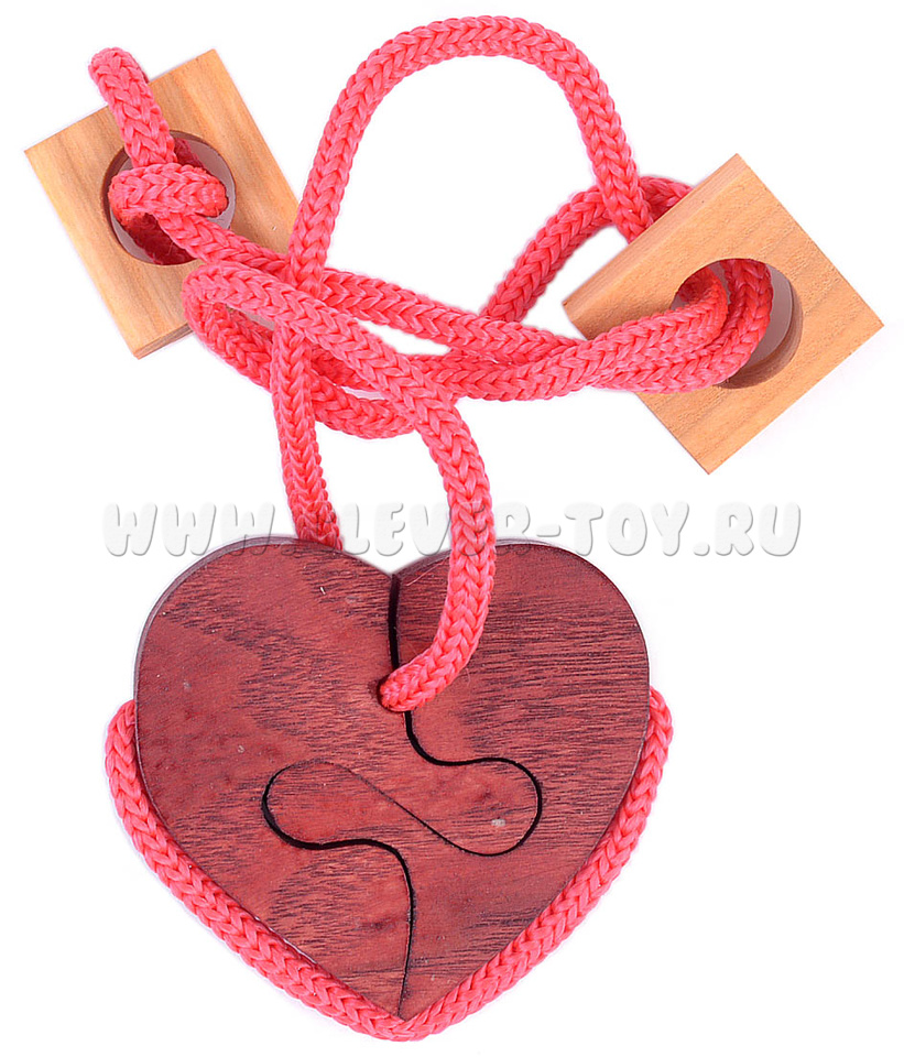 Головоломка "Разбитое сердце 2" представляет собой две деревянных детали сердца и две детали для дополнительного усложнения. Цель задачи - соединить две части сердечка таким образом, чтобы они образовывали единое целое, а шнурок им не мешал.