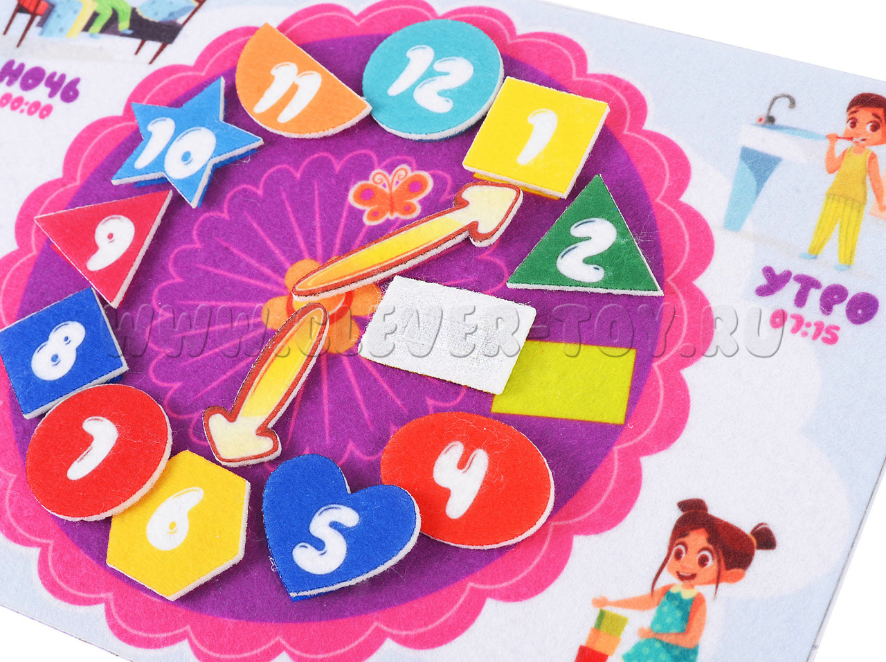 Во-вторых, каждый набор Веселых липучек посвящен определенной тематике. Этот – времени. Эта многоразовая аппликация поможет детям познакомиться с часами и временными промежутками.