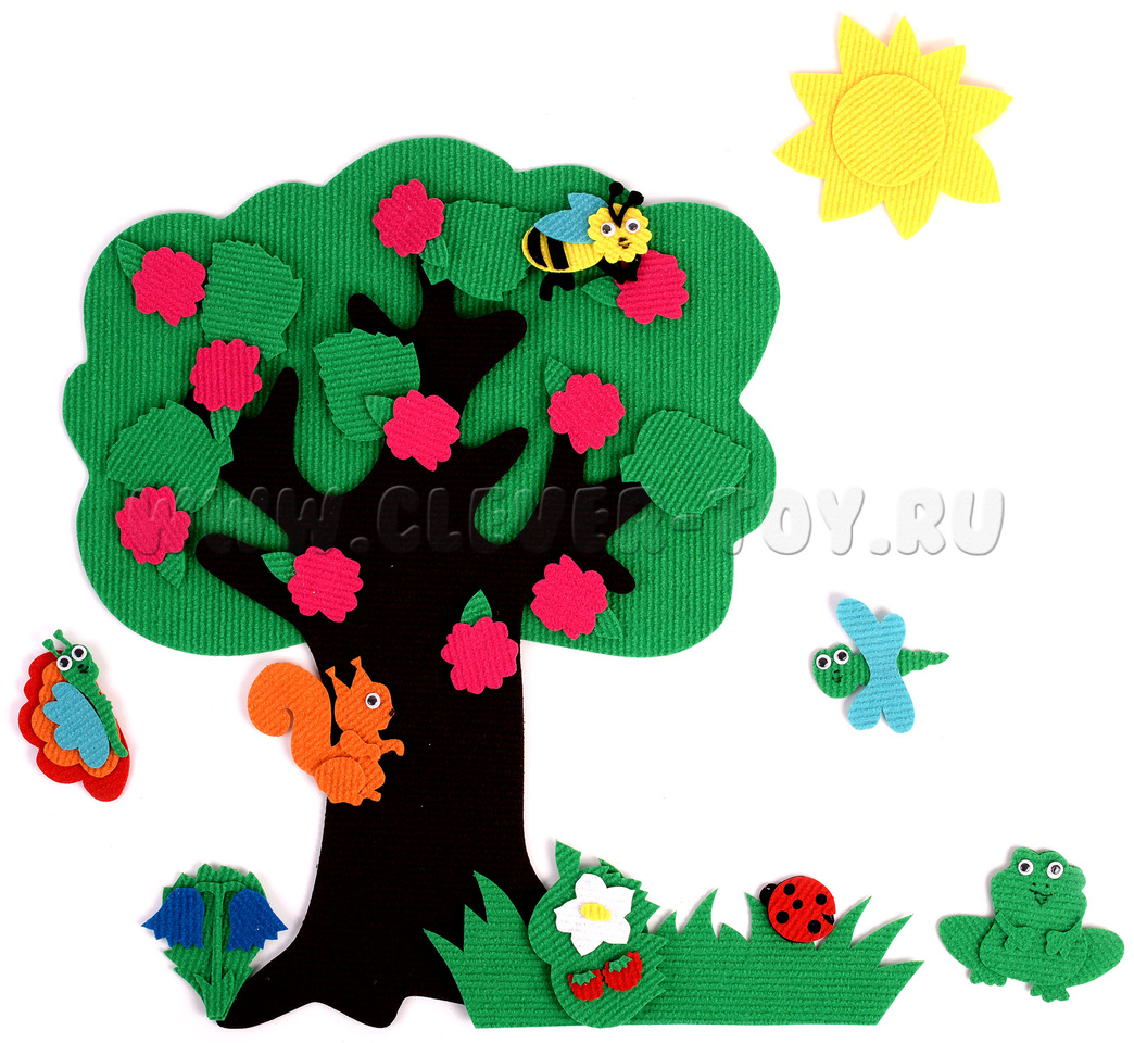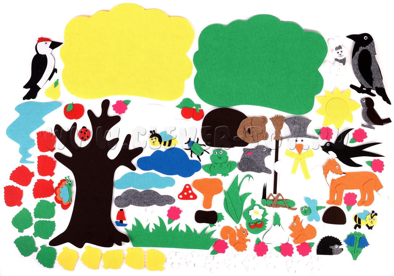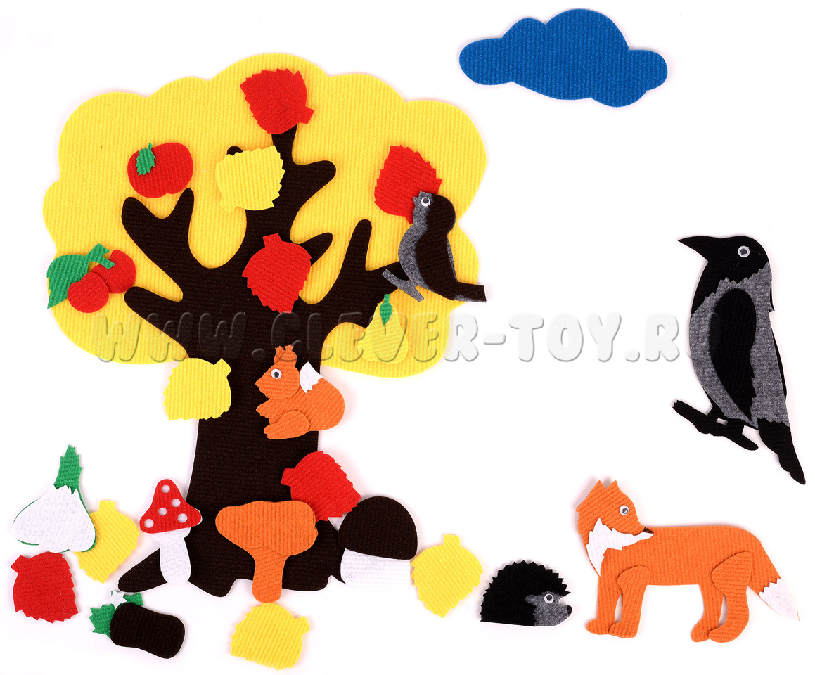 • растения – груша, яблоко, клубника, шиповник, крона жёлтая, крона зелёная, ствол дерева, листочки зелёные, красные, жёлтые, цветочки – 10 шт.;