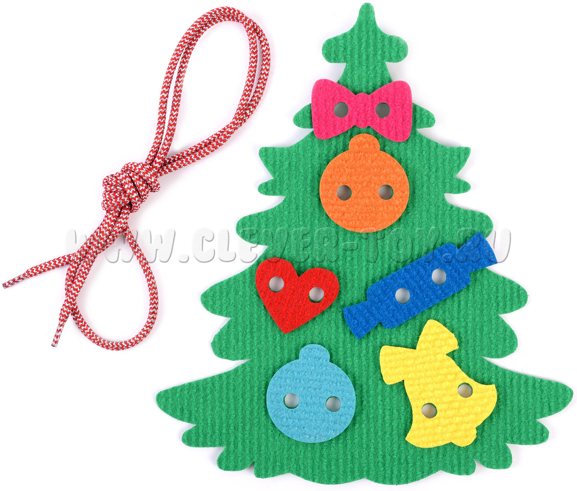 Завязывание шнурков – непростая задача для ребенка. В этом ему поможет елка – конструктор на шнуровке. Регулярные занятия с данным учебным пособием сформируют у малыша терпение, усидчивость и аккуратность, а также дадут представление о формах и цветах.