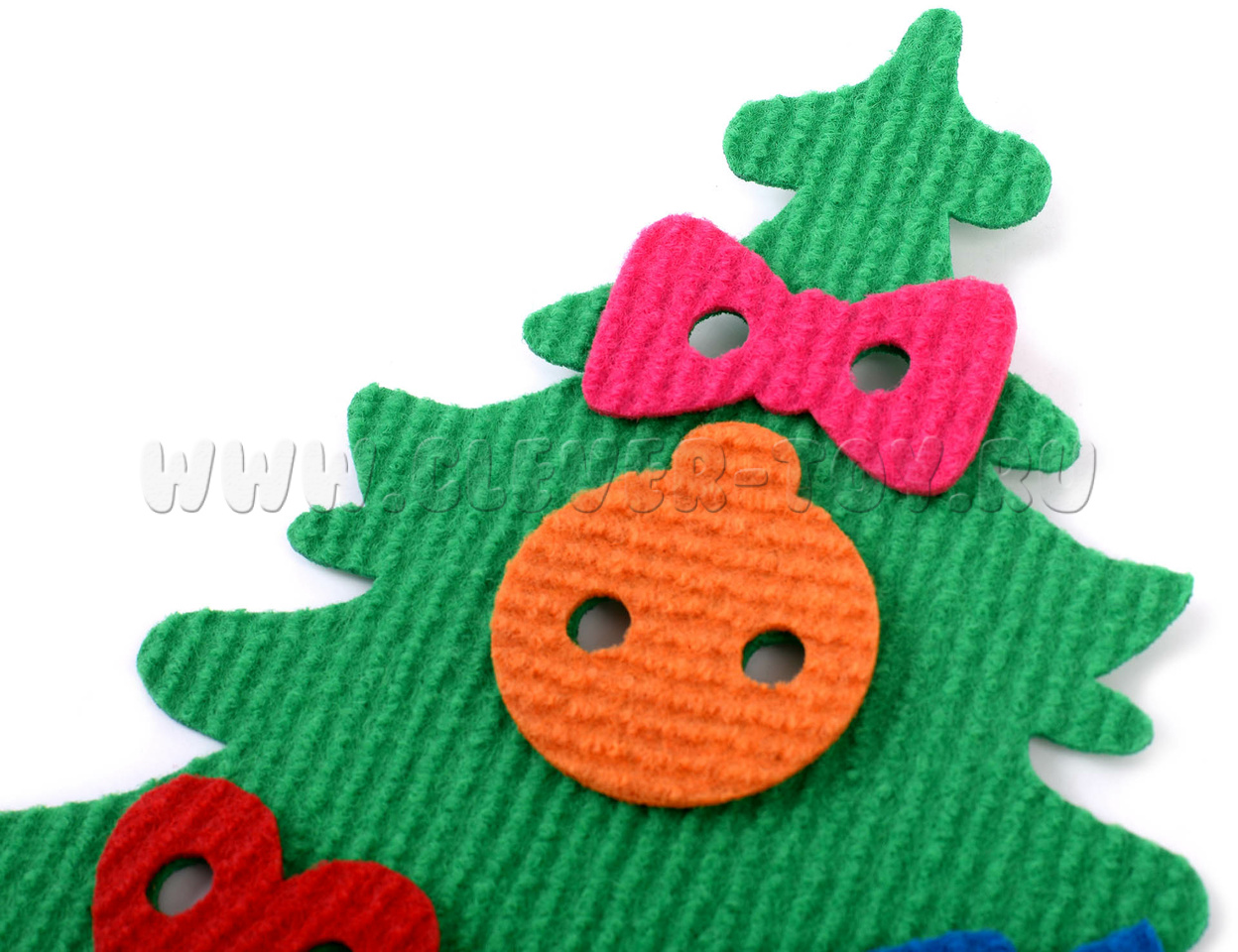 Елка изготовлена из ковролина. Материал делает игрушку плотной, долговечной, но при этом приятной на ощупь и безопасной для детей.