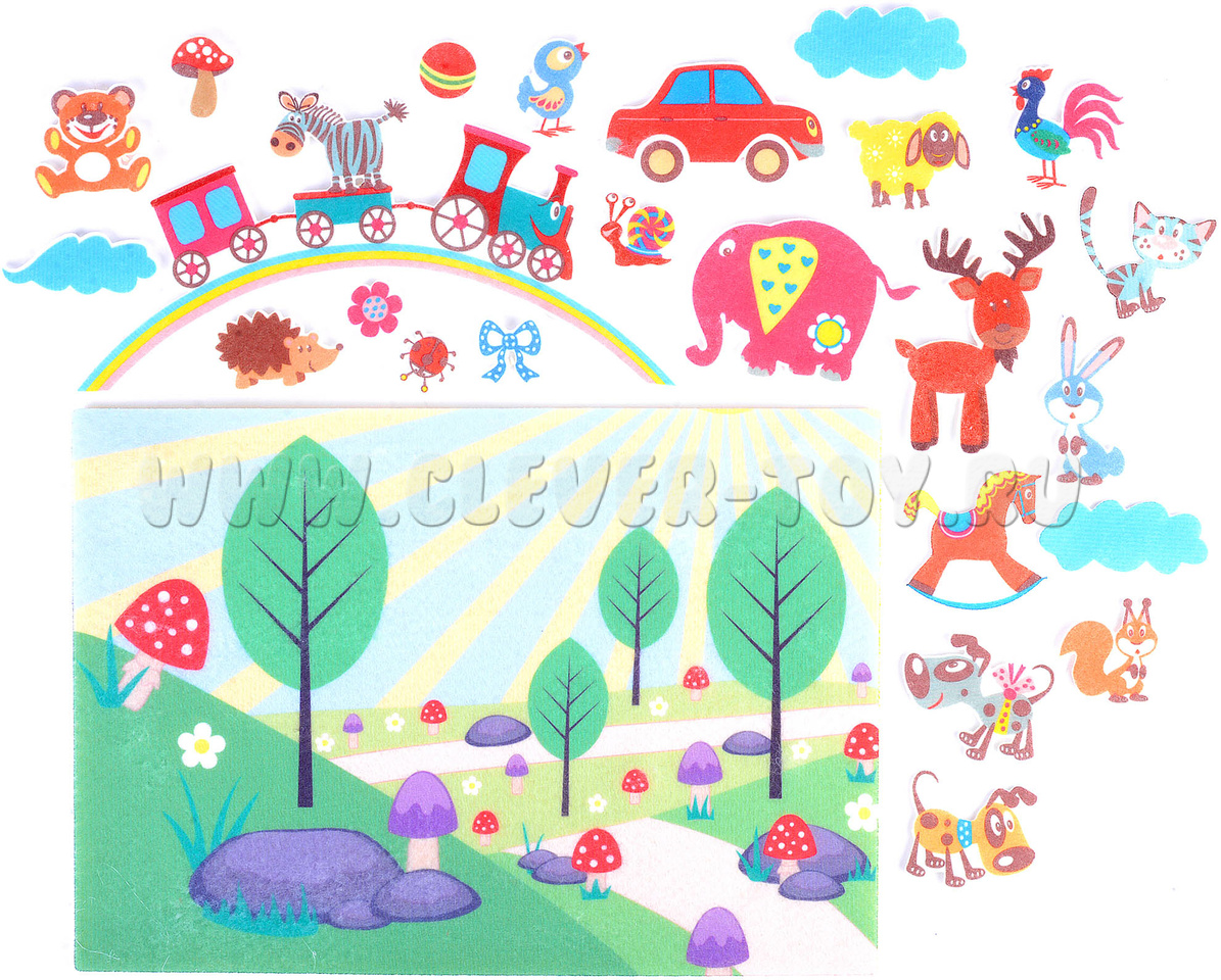 - грибок, тучки, цветочек, бантик, радуга с паровозиками, куда можно посадить зверей;