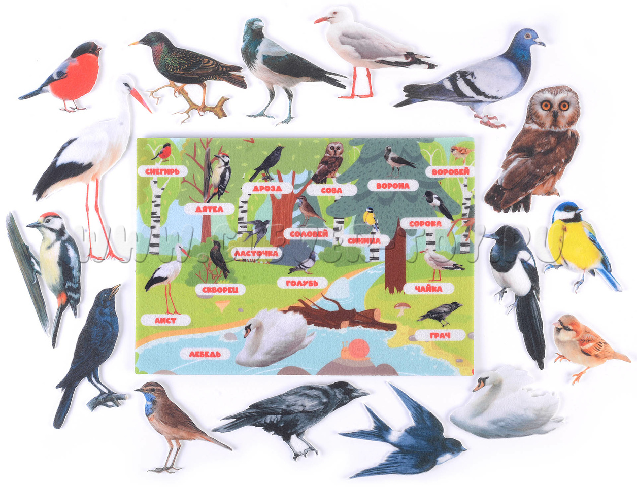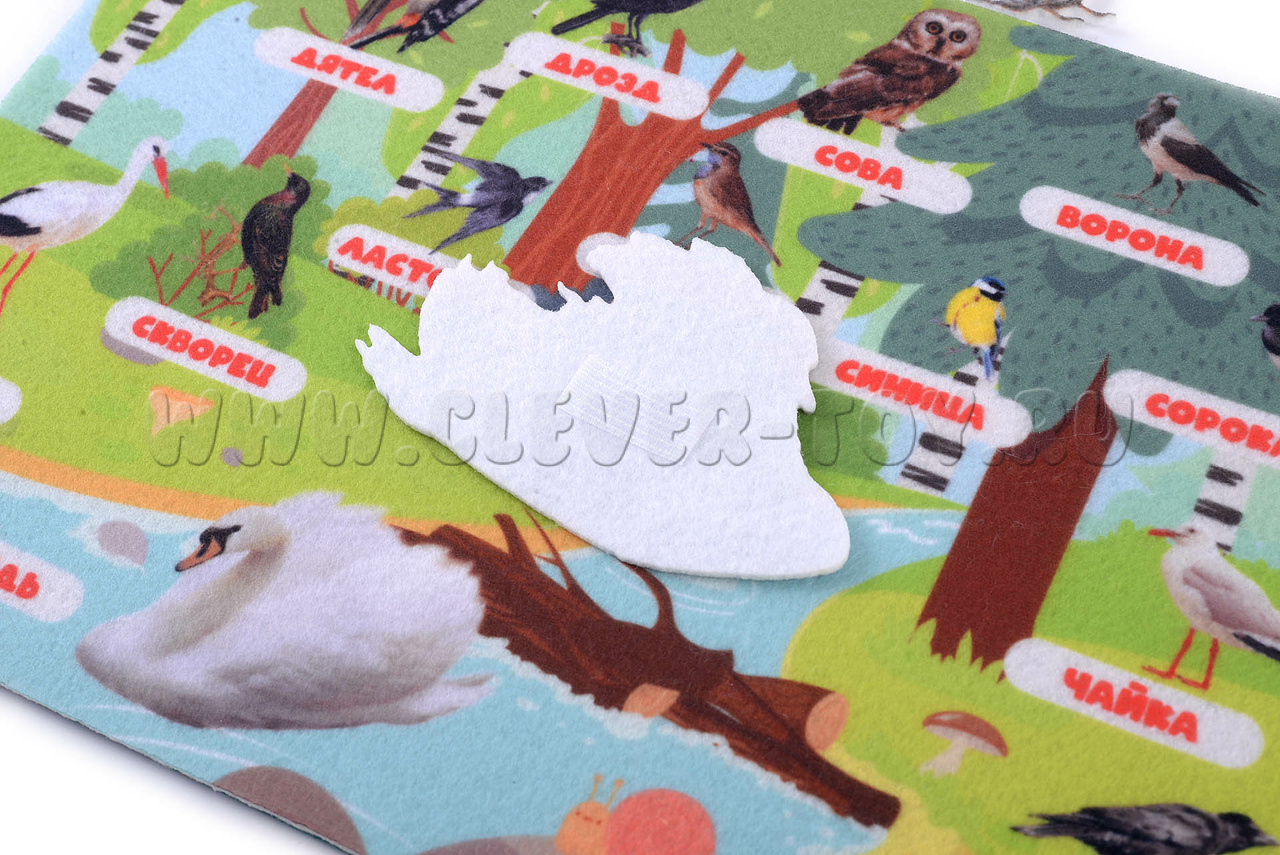 • Набор из 16 фигурок птиц на липучках (снегирь, дятел, дрозд, сова, ворона, воробей, ласточка, соловей, синица, сорока, скворец, голубь, чайка, аист, лебедь, грач)
