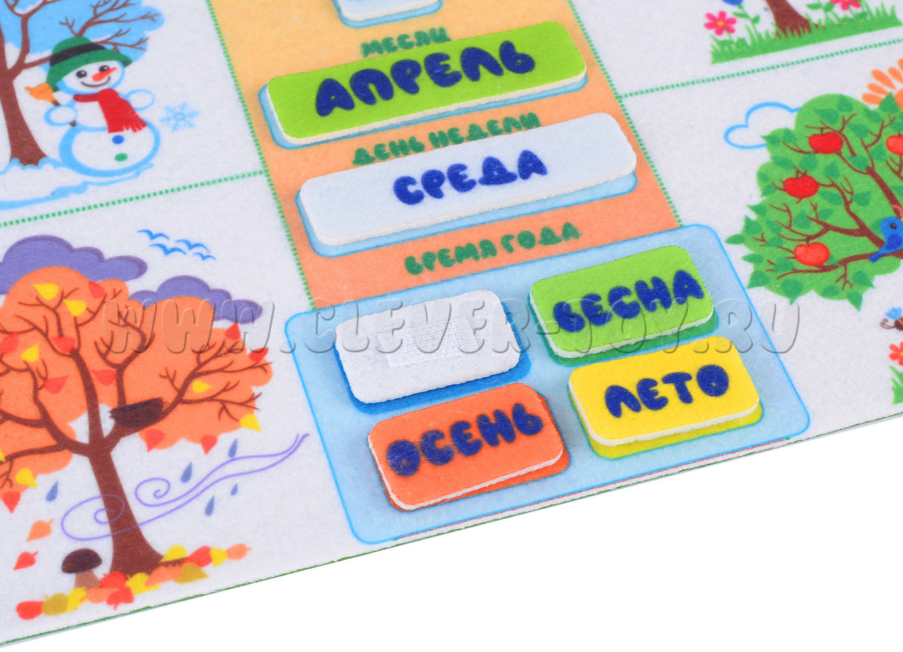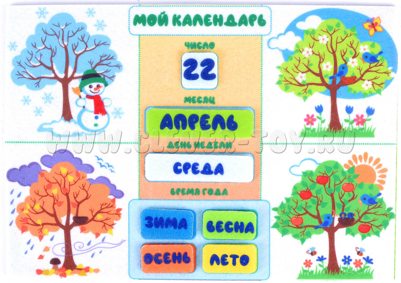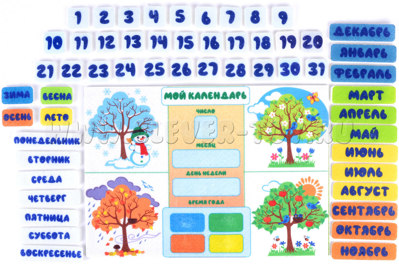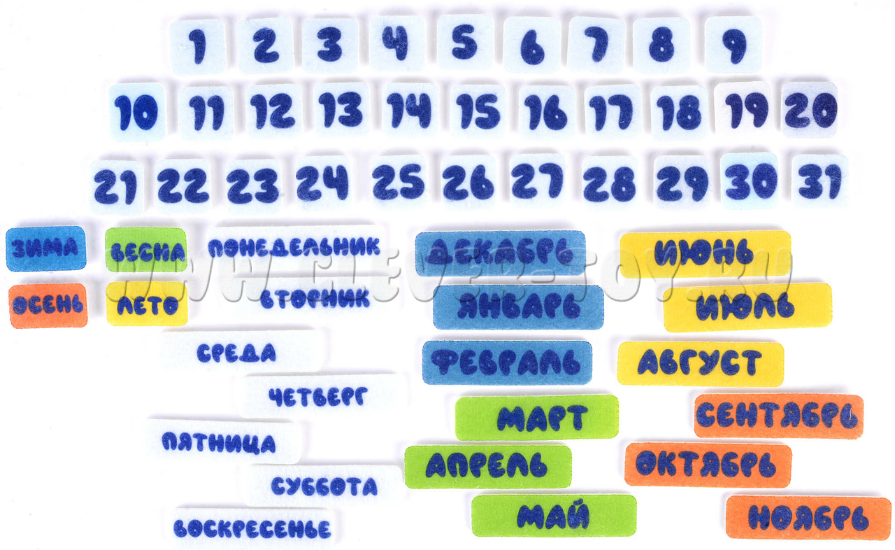 • игровые элементы: числа от 1 до 31, элементы с названиями дней недели, месяцев, времён года и т.д.