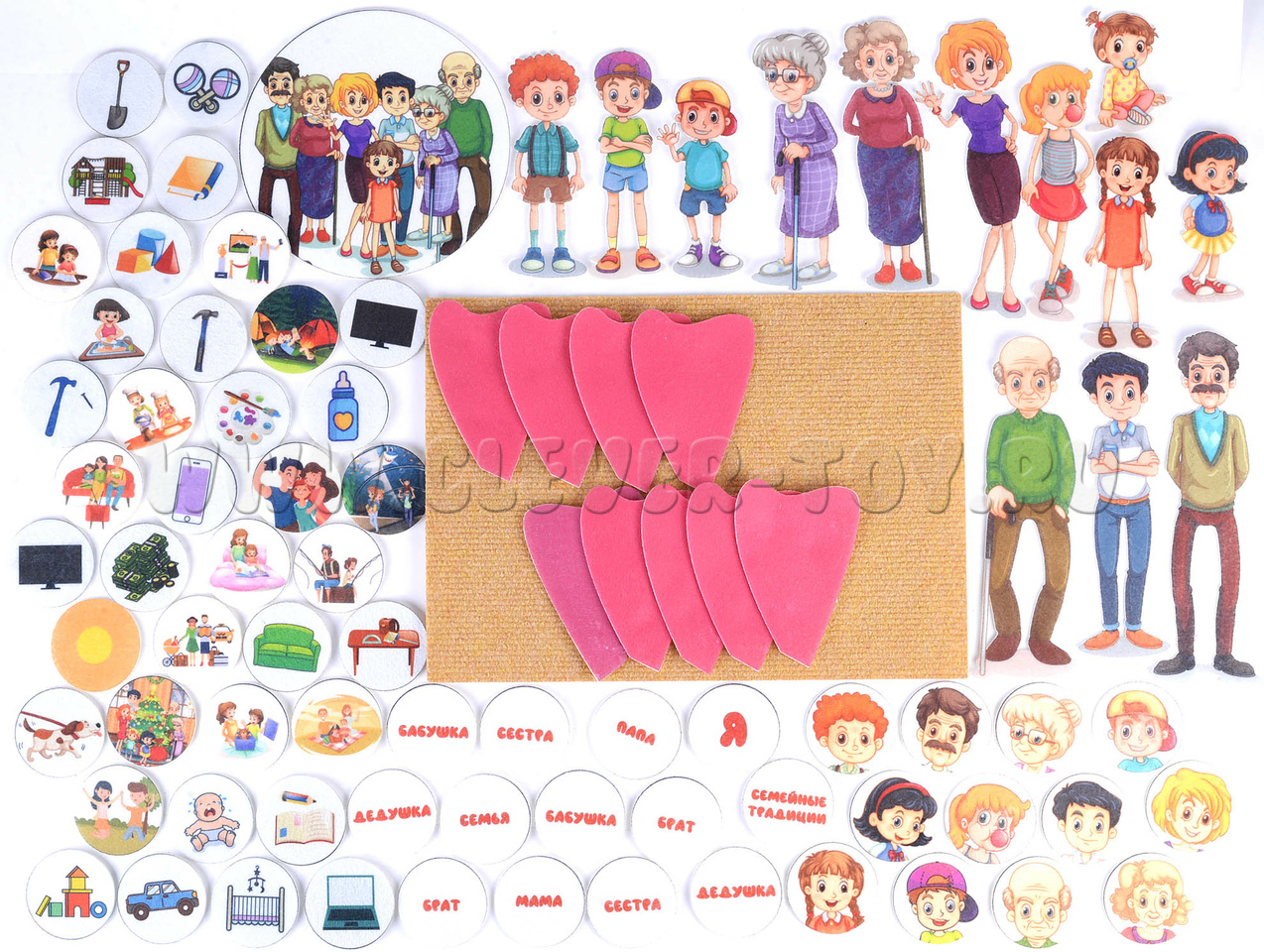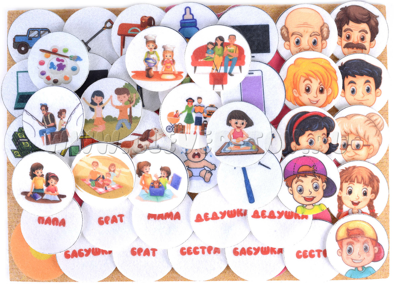 Игровое поле 25*35см, фигурки семьи, названий, портреты, фигурки занятий с детьми, лепестки.