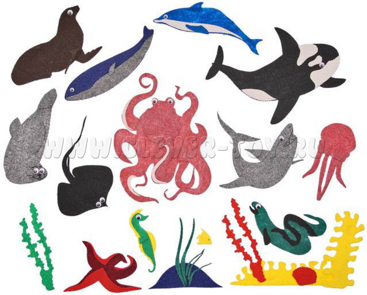 • обитатели моря: осьминог, касатка, морской котик, тюлень, кит, акула, скат, медуза, морской конёк, дельфин, мурена, морская звезда, рыбка;