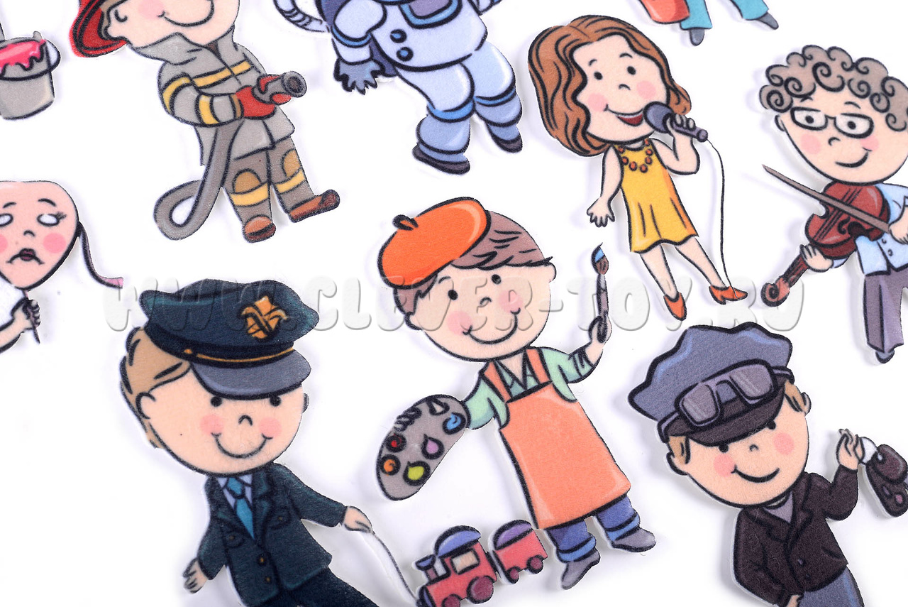 В комплект входит 14 карточек с изображениями представителей разных профессий. На обратной стороне каждой карточки есть липучка, благодаря которой её можно прикрепить к ковролиновой основе или фетру. Эта развивающая игра подходит для детей от года. Её можно использовать в детском саду, дома для индивидуальных занятий или вместе с логопедом.