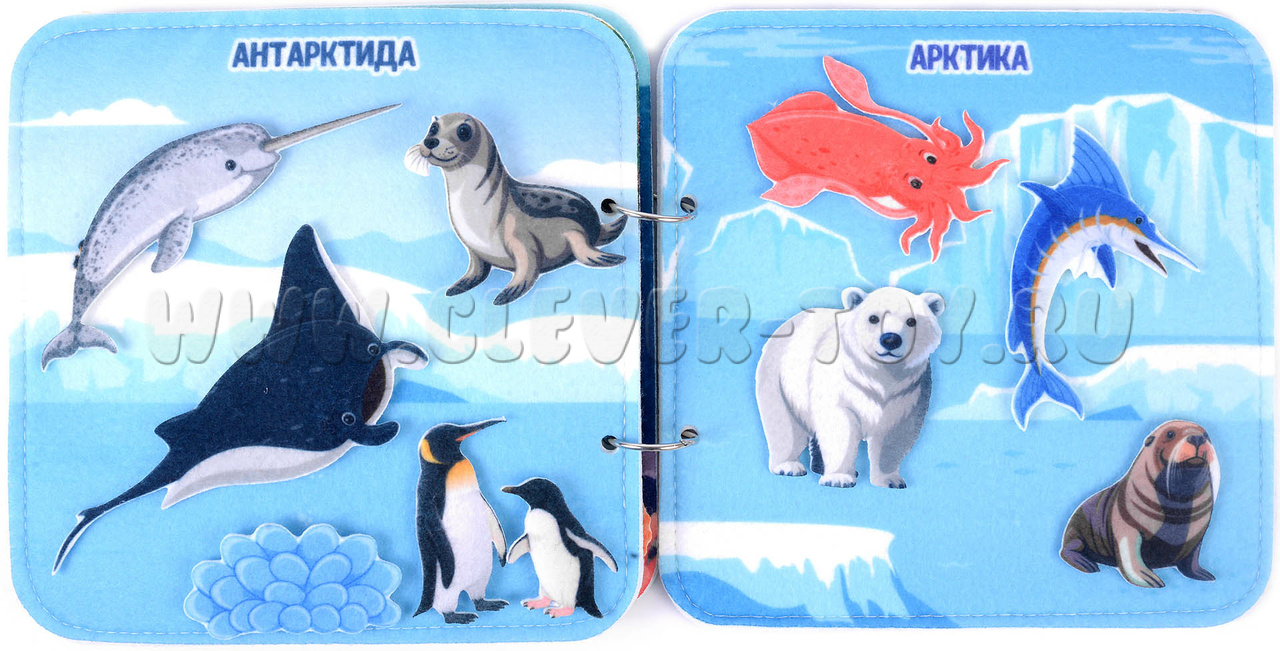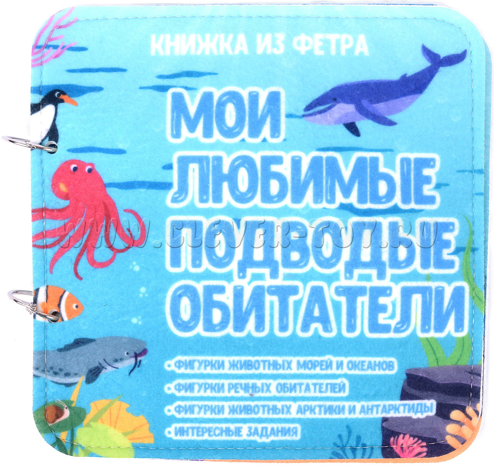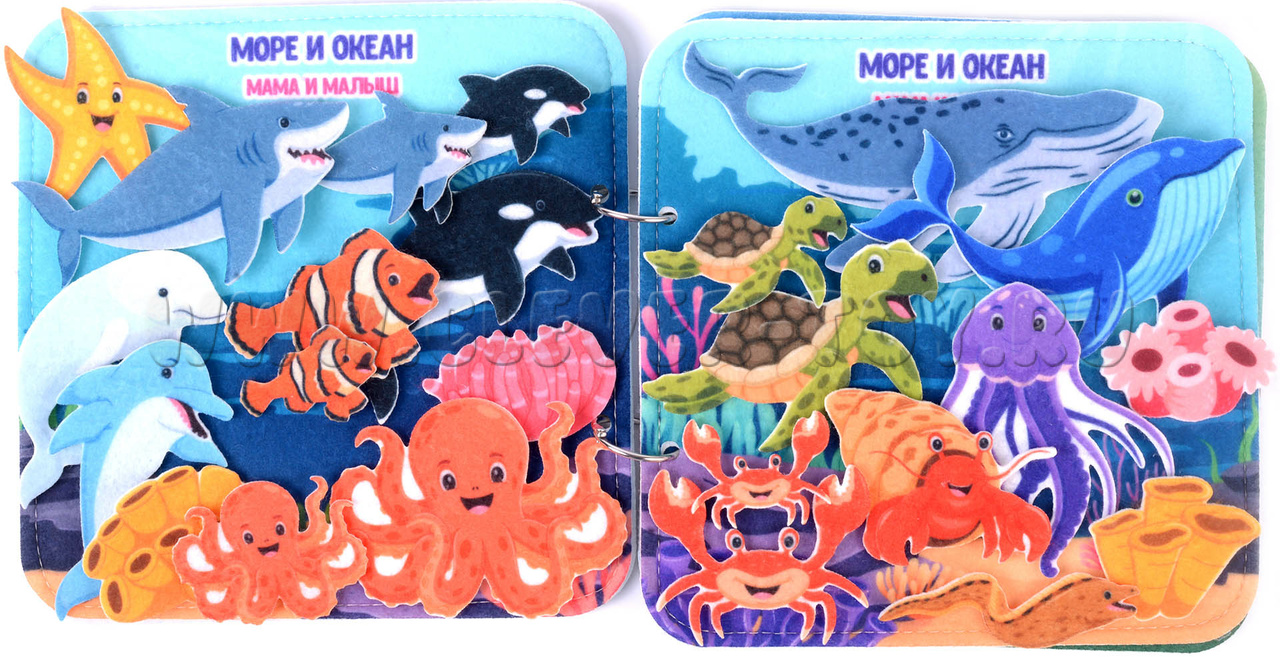 Морские обитатели - мягкая развивающая книга для знакомства ребёнка дошкольного возраста с миром, находящимся под водой. Играя и занимаясь, ребёнок расширяет кругозор, знакомится с названиями и внешним видом морских жителей и растений, развивает логику, фантазию.