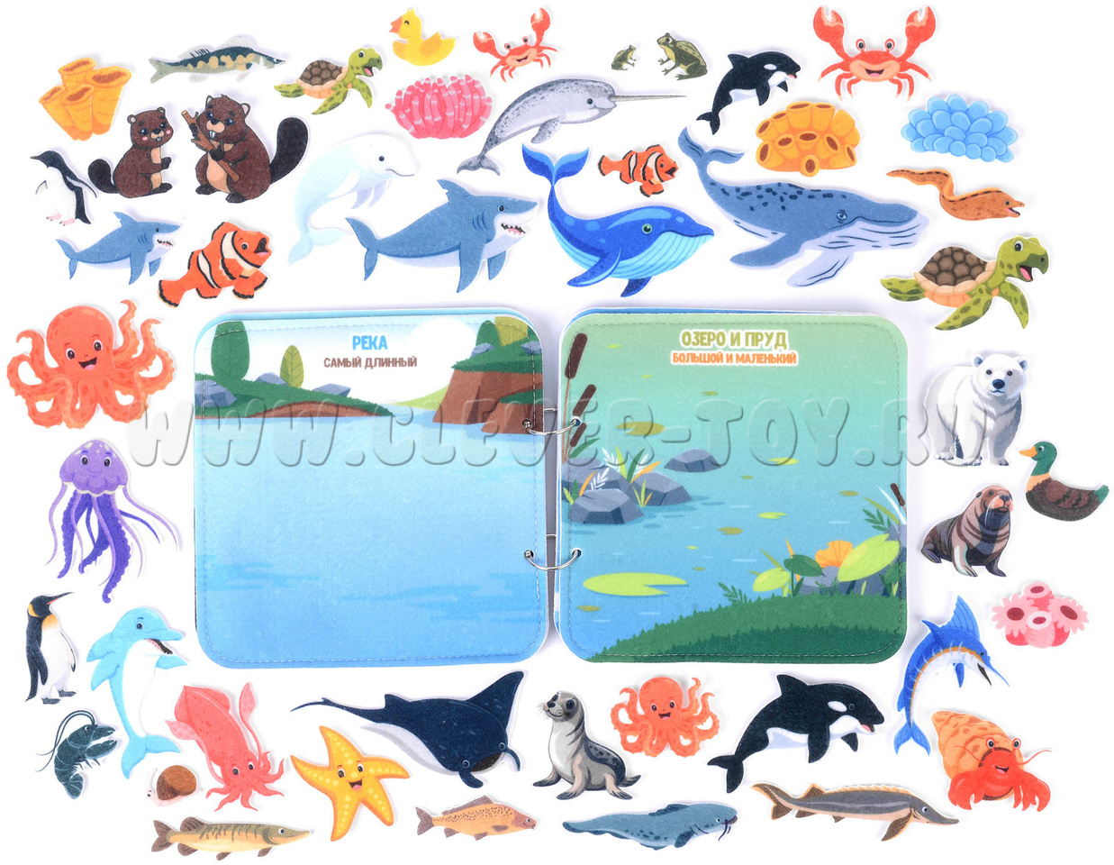 В комплекте книга и фигурки обитателей водных глубин выполненные в мультяшной забавной форме.