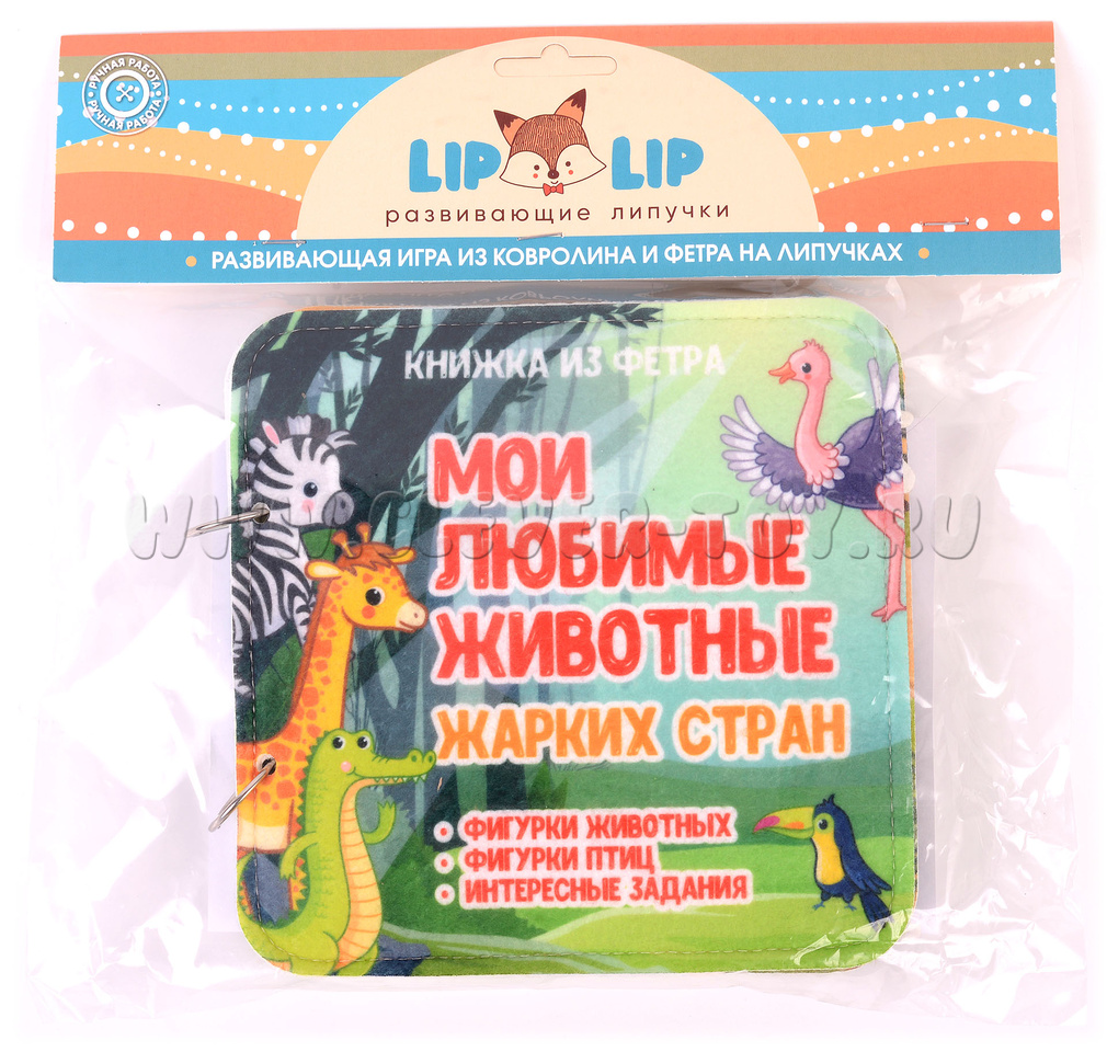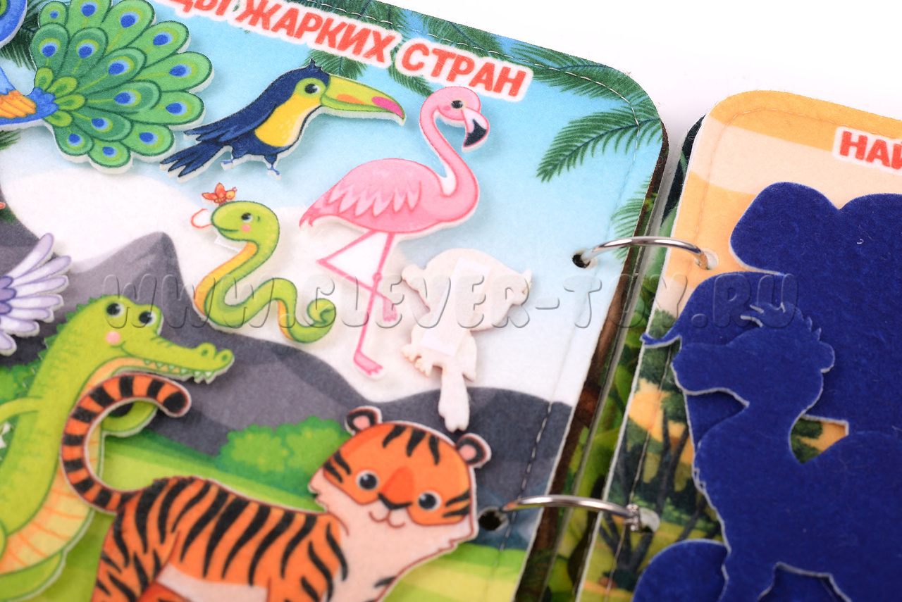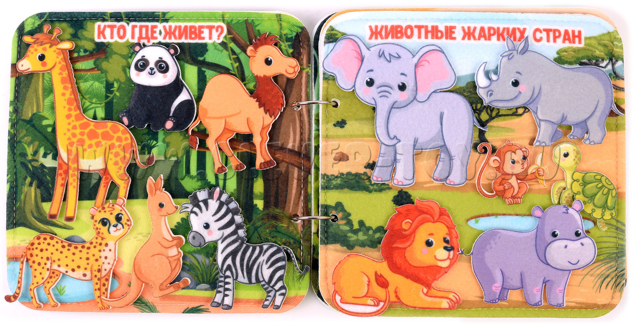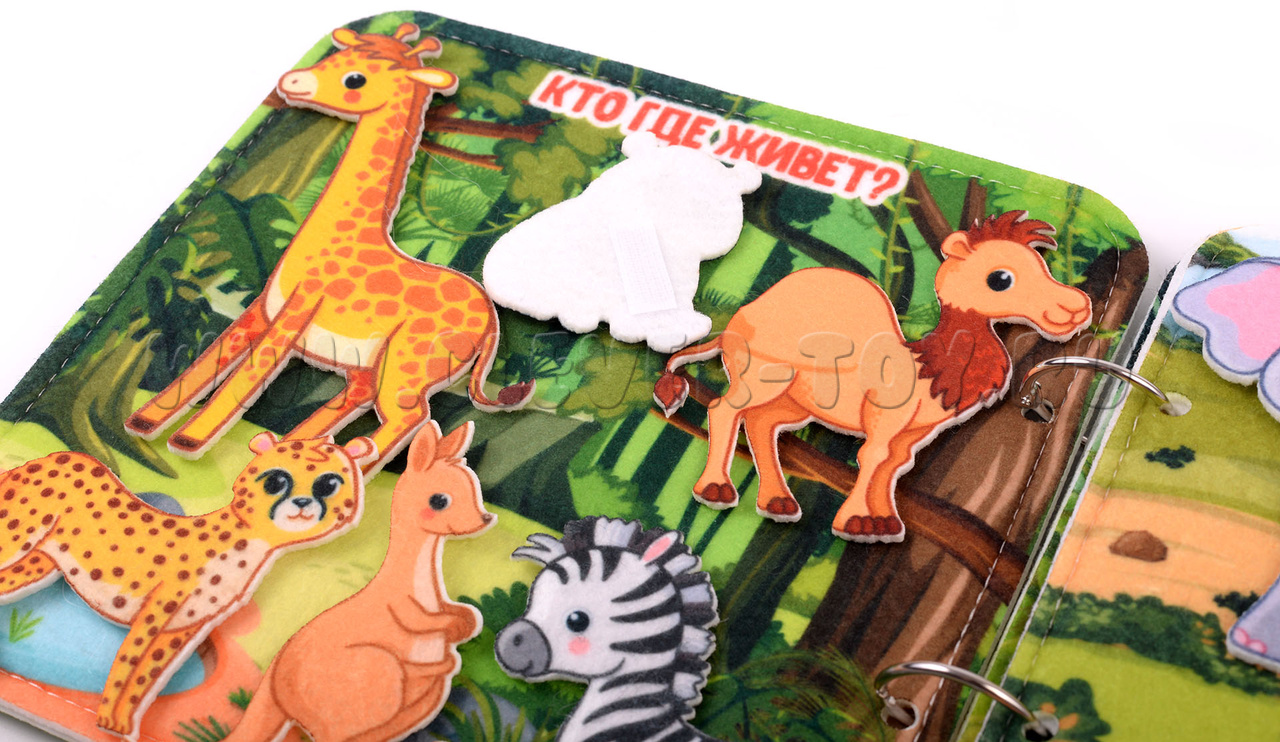 Авторская развивающая книга "Животные жарких стран" из ковролина с фигурами на липучках от российской компании "Лип-Лип".