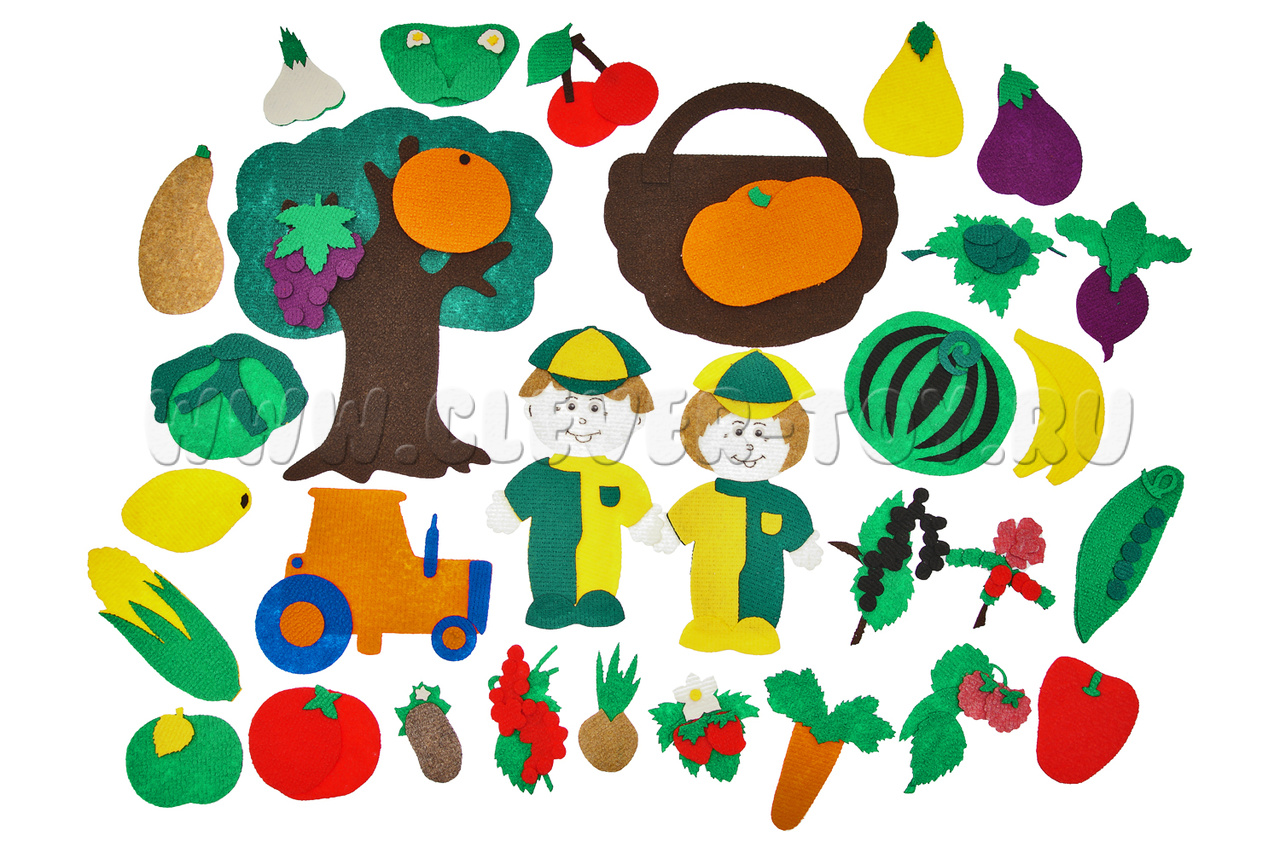 - герои – мальчик и девочка (каждый по 25*15 см); предметы – трактор (20*15 см), дерево (30*30 см), корзина (26*26 см);