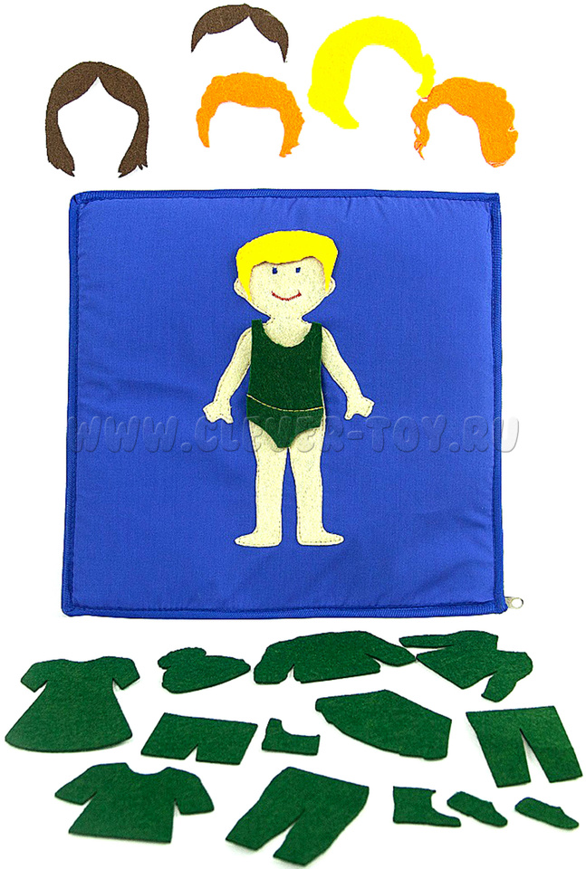• одежда и обувь (синий, красный, желтый, зеленый) - куртка, теплые штаны, шапочка, пуловер, футболка, шорты, брюки, юбка, платье, трусики с маечкой, туфли, сапоги;