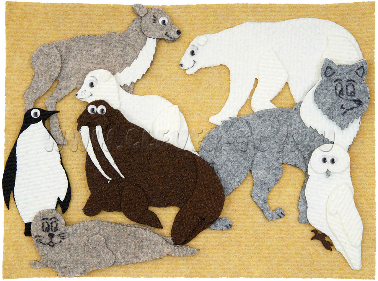 • белый медведь, волк, песец, пингвин, северный олень, тюлень, морж, полярная сова;