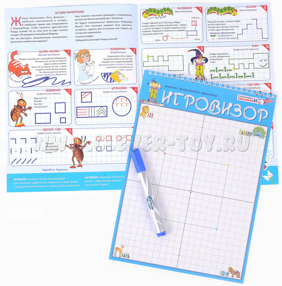 Графический тренажёр (с функцией пиши-стирай) для обучения, детского творчества и досуга. Вечный экран так можно назвать верхний прозрачный лист этого альбома. Любой маркер на водной основе оставляет на нём след, который можно легко стереть салфеткой.
