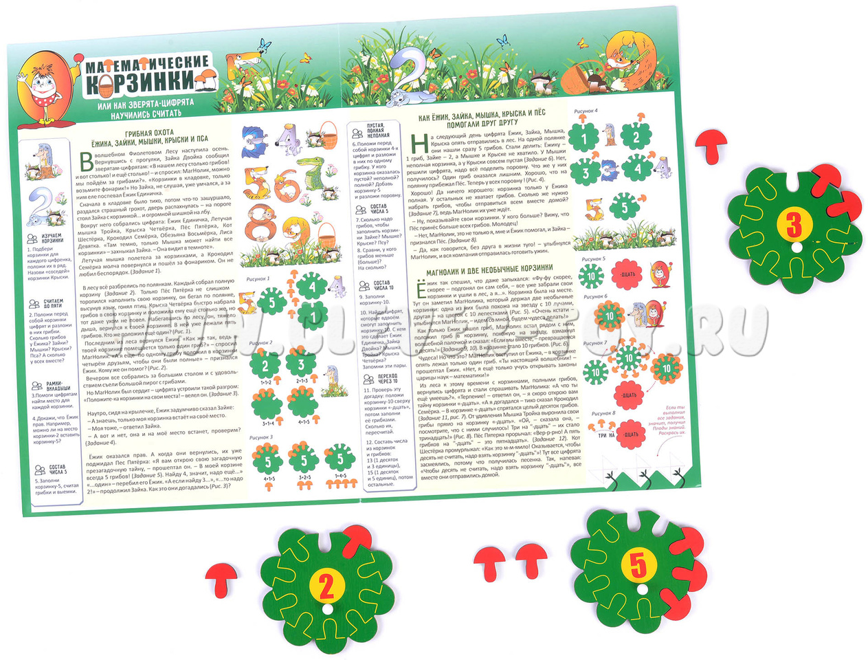 В комплект также входит инструкция с описанием 12-ти увлекательных игр и занятий для обучения ребёнка основам математики. Главные герои игр – зверята-цифрята – любят собирать грибы. У каждого есть своя полянка и своя корзинка. Примеры игр: «Как цифрята поделили грибы», «Кто набрал грибов больше всех?», «Добавь грибок» и другие.