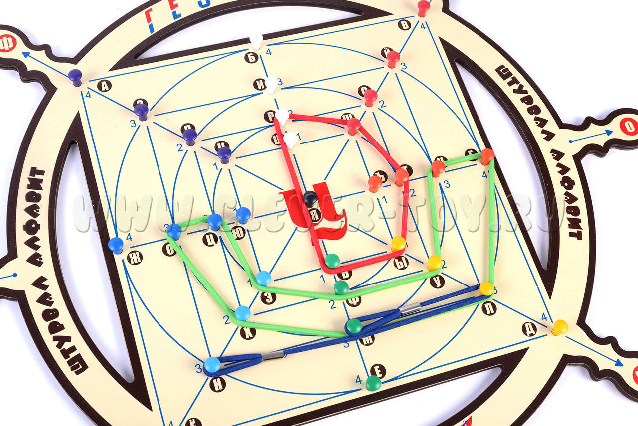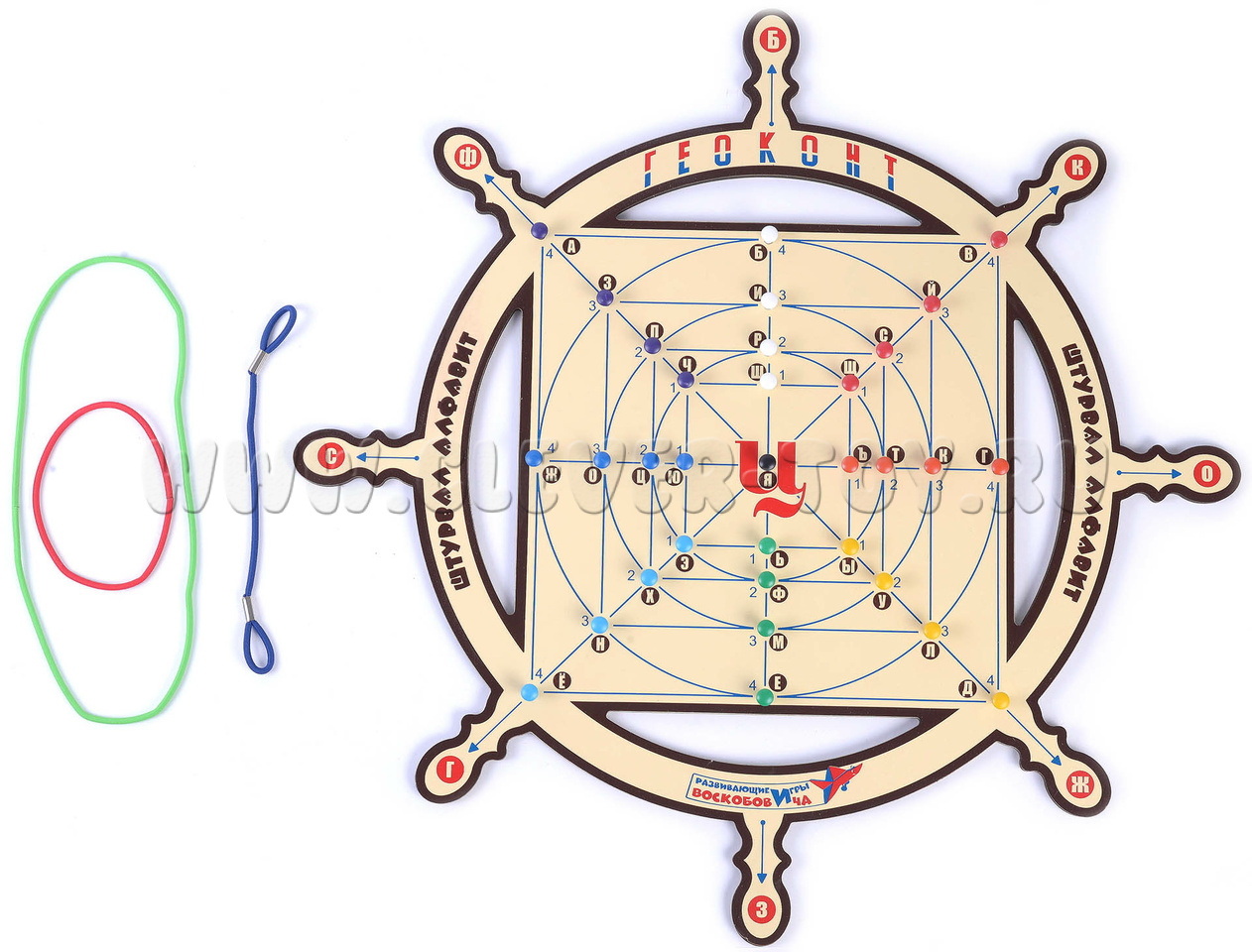 На игровом поле «Геоконта» нарисована координатная сетка. Она состоит из лучей, обозначенных буквами Б, К, О, Ж, З, Г, С, Ф, и пересекающихся геометрических фигур. Точки координатной сетки – это пересечения лучей и геометрических фигур. В этих точках установлены гвоздики с номерами. Таким образом, у каждого гвоздика есть «имя» - Ф1, Ф2,Ф3, Ф4 и т.д.