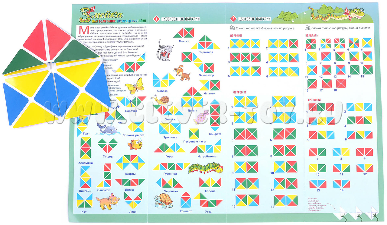 • как складывать плоскостные фигуры: так, чтобы они были походи на рисунок сначала по форме, затем – по форме и цвету; в первом разделе приведено 35 схем-рисунков, которые помогут превратить головоломку в конфету, золотую рыбку, рубашку и шорты, лису, улитку, гусеницу, истребитель и т.д.