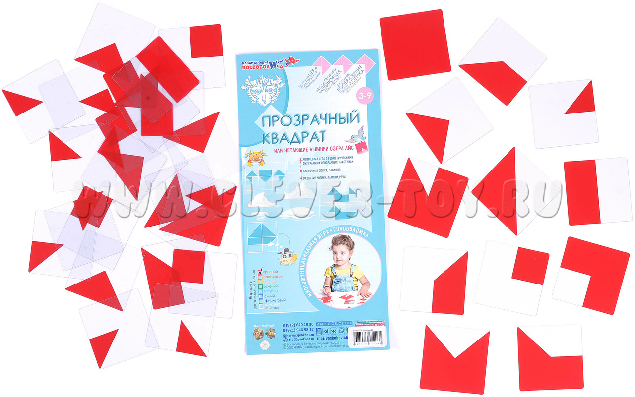 Красный Прозрачный квадрат от фирмы «Развивающие игры Воскобовича» - один из серии «Прозрачных квадратов» разных цветов (синий, жёлтый, зелёный). Пособия можно использовать по отдельности, а также комбинировать все 4 цвета квадратов, смешивая цвета и получая новые сочетания: оранжевый, фиолетовый, коричневый и т.д.