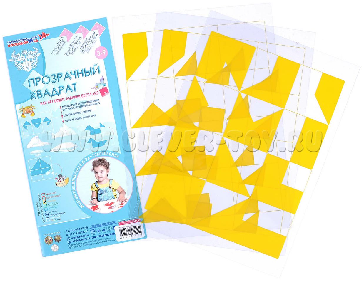 Жёлтый Прозрачный квадрат от фирмы «Развивающие игры Воскобовича» - один из серии «Прозрачных квадратов» разных цветов (синий, зелёный, красный). Пособия можно использовать по отдельности, а также комбинировать все 4 цвета квадратов, смешивая цвета и получая новые сочетания: оранжевый, фиолетовый, коричневый и т.д.