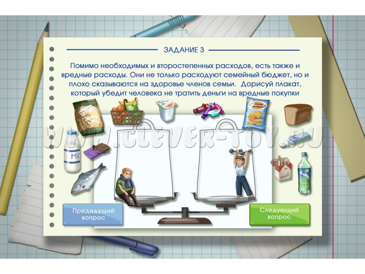 Это методический интерактивный комплекс, включающий многофункциональный сенсорный компьютер, экран с диагональю 32″, а также новейшее программное обеспечение из более чем 100 аналитических и творческих задач на тему финансовой грамотности, разделенных на 4 блока: