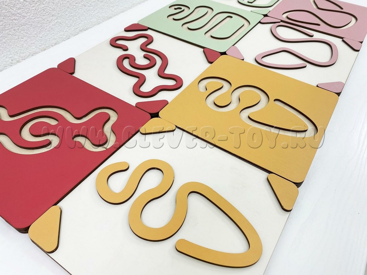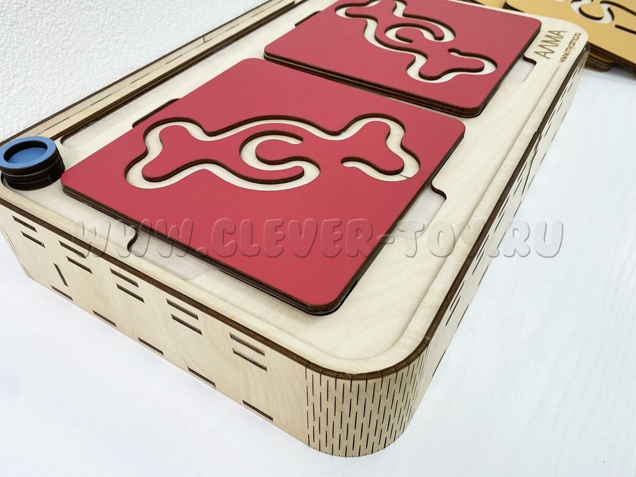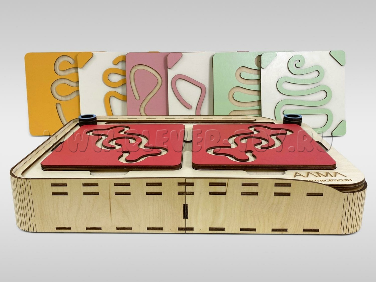 Два лабиринта с изображениями, расположенными симметрично, вставляются в пазы, и ребёнок проходит их с помощью специальных пальчиковых фишек.