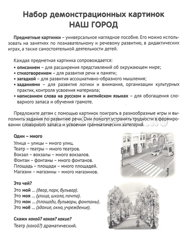 На обороте каждой предметной картинки - описание, стихотворение, загадка, вопросы для ребёнка, название на русском и английском языках.