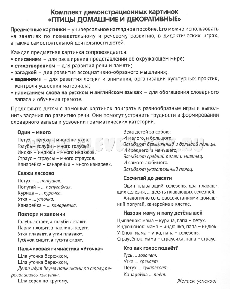 Набор карточек "Птицы домашние и декоративные" состоит из бесед, стихотворений, загадок и вопросов по теме. Комплект включает 16 цветных демонстрационных картинок с текстом на обороте, названия тем имеют перевод на английский язык.