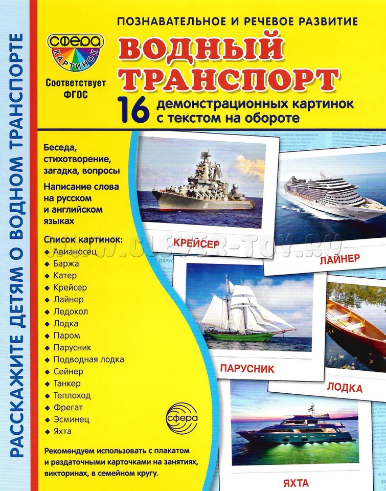 Комплект серии "Сфера картинок" под названием "Водный транспорт" состоит из 16 цветных демонстрационных карточек (картинок) и адресован детям, желающим познакомиться с видами водного транспорта. Дошкольники и младшие школьники узнают об особенностях пассажирских, грузовых и военных судов, историей их создания, научатся различать катера, лодки, яхты, познакомятся с устройством судов и их командой.