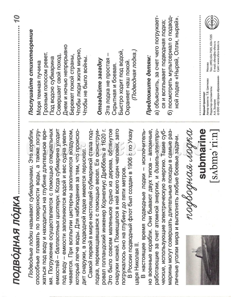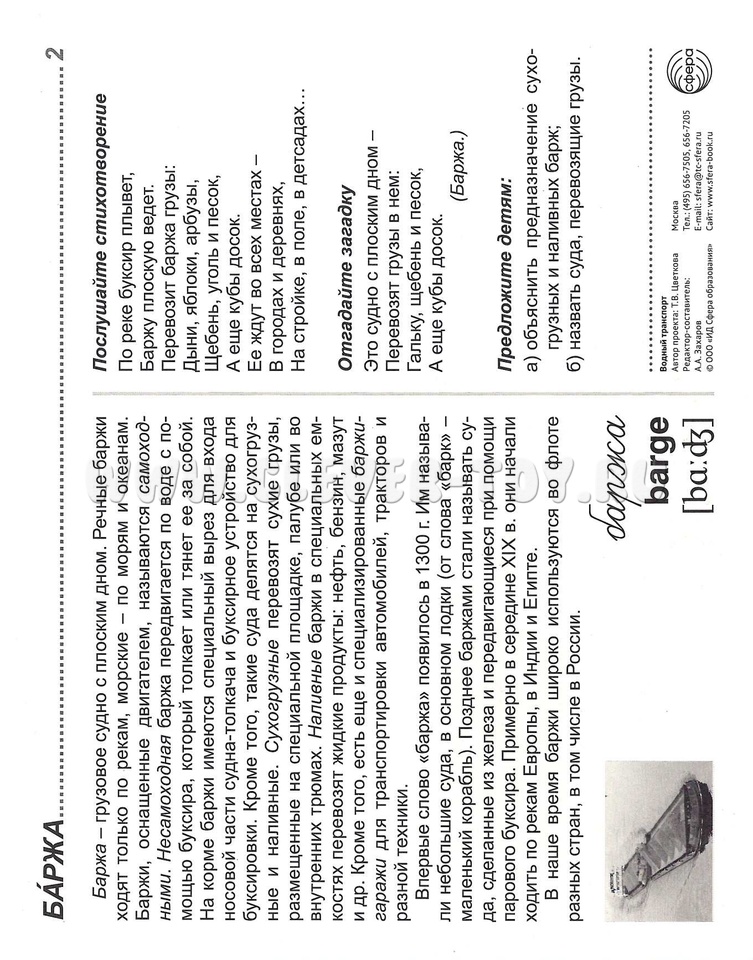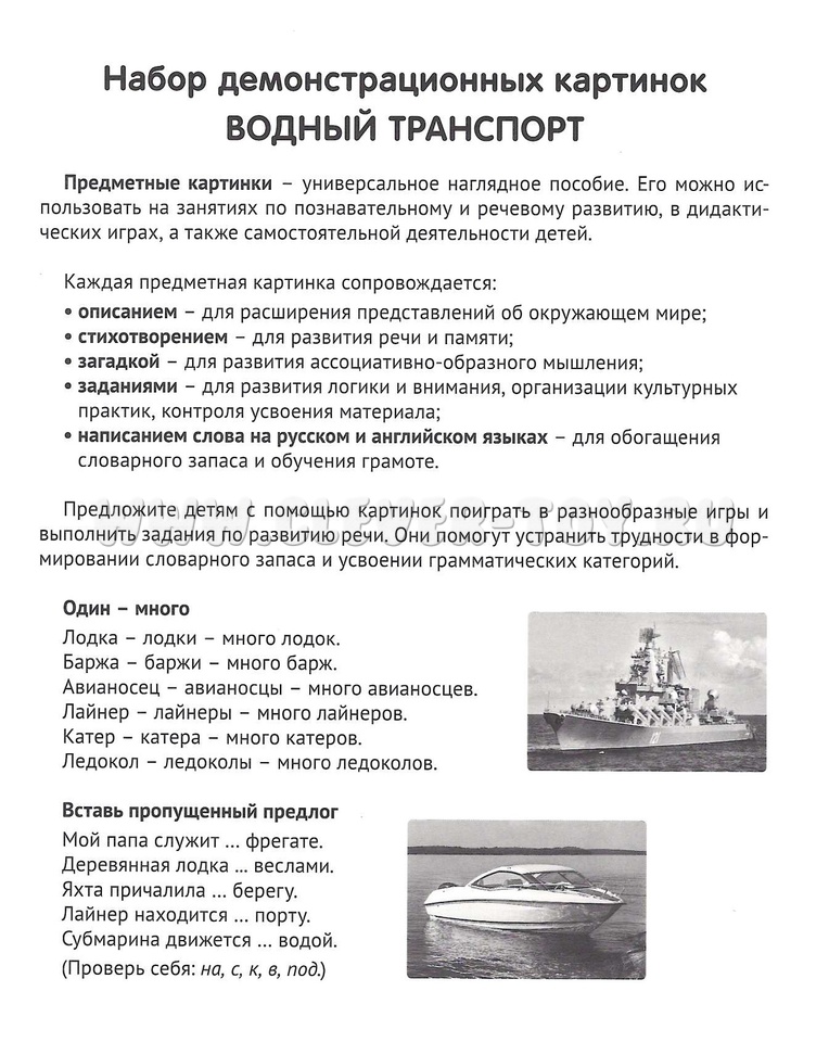 На лицевой стороне каждой карточки дается цветное изображение, на обратной - подробное описание, из которого дети узнают немало интересного о различных судах. Для лучшего закрепления материала представлены оригинальные стихотворения и загадки по теме, а также задания, которые ребенок может выполнить самостоятельно или с помощью взрослого. Комплект подходит для индивидуальной и групповой работы, может использоваться на тематических вечерах и викторинах, посвященных водному транспорту.