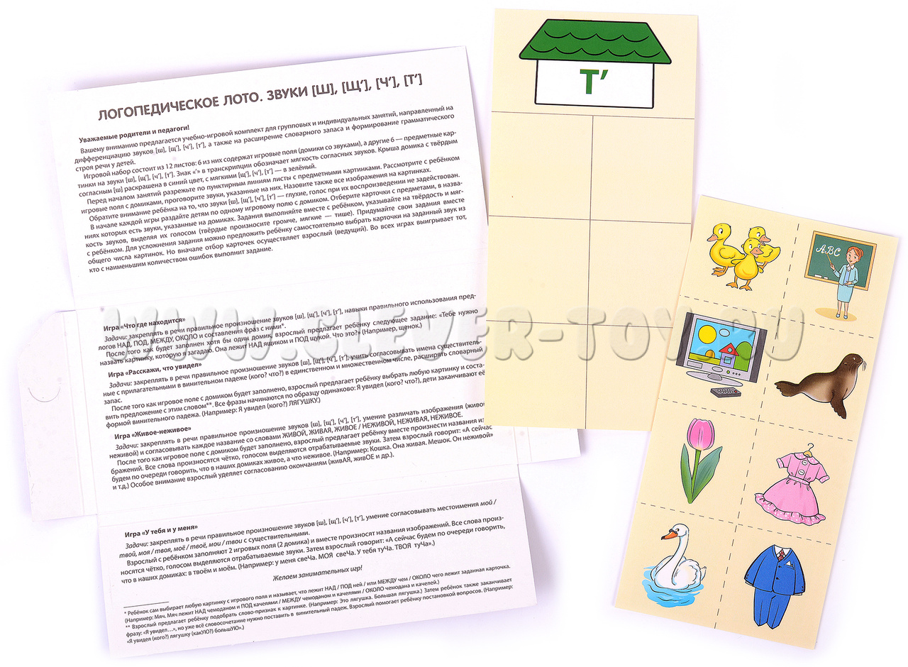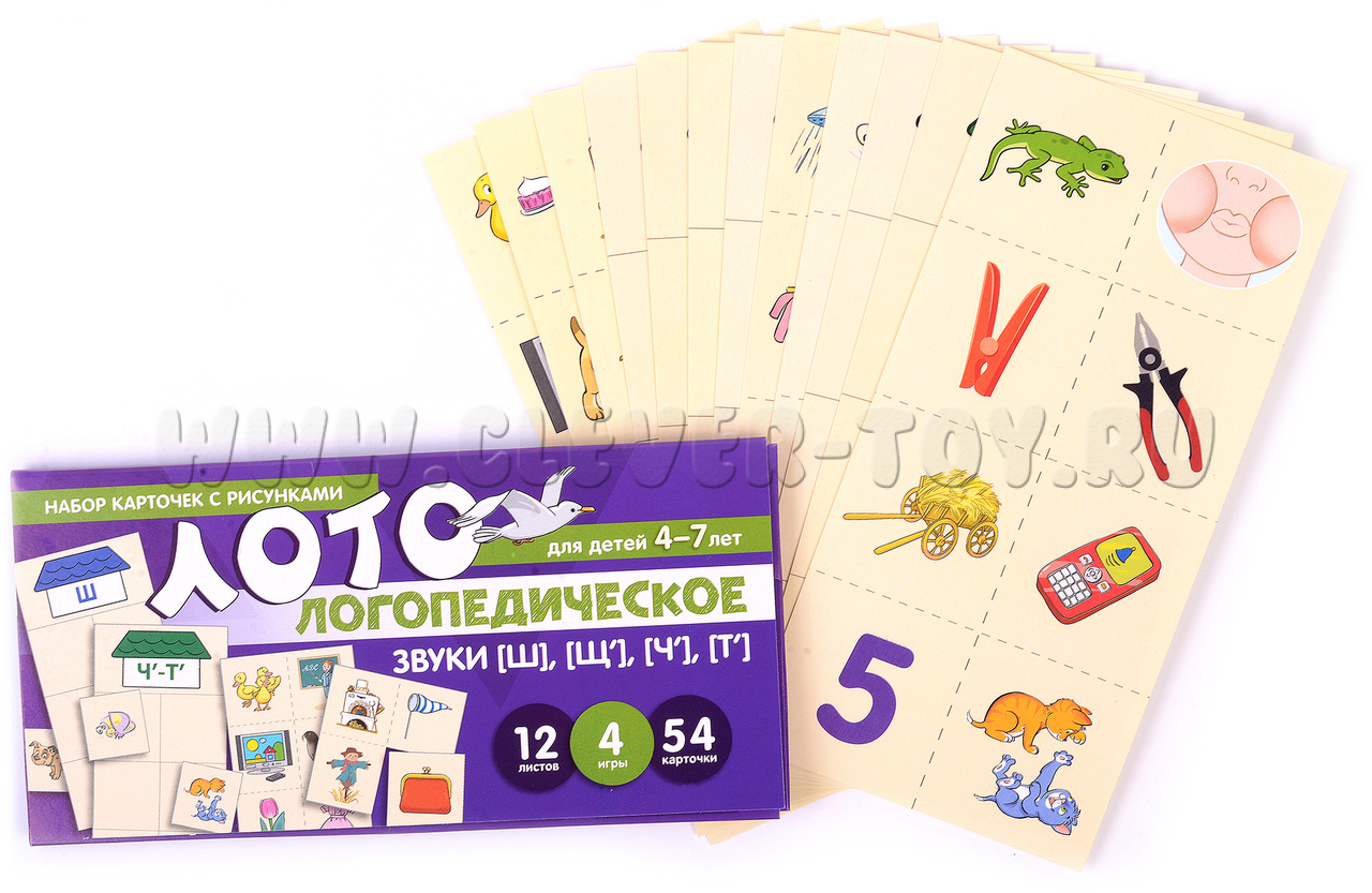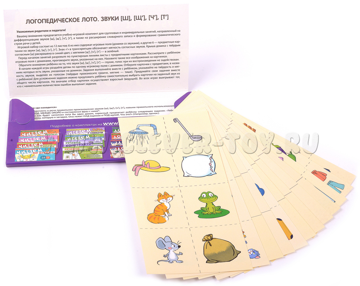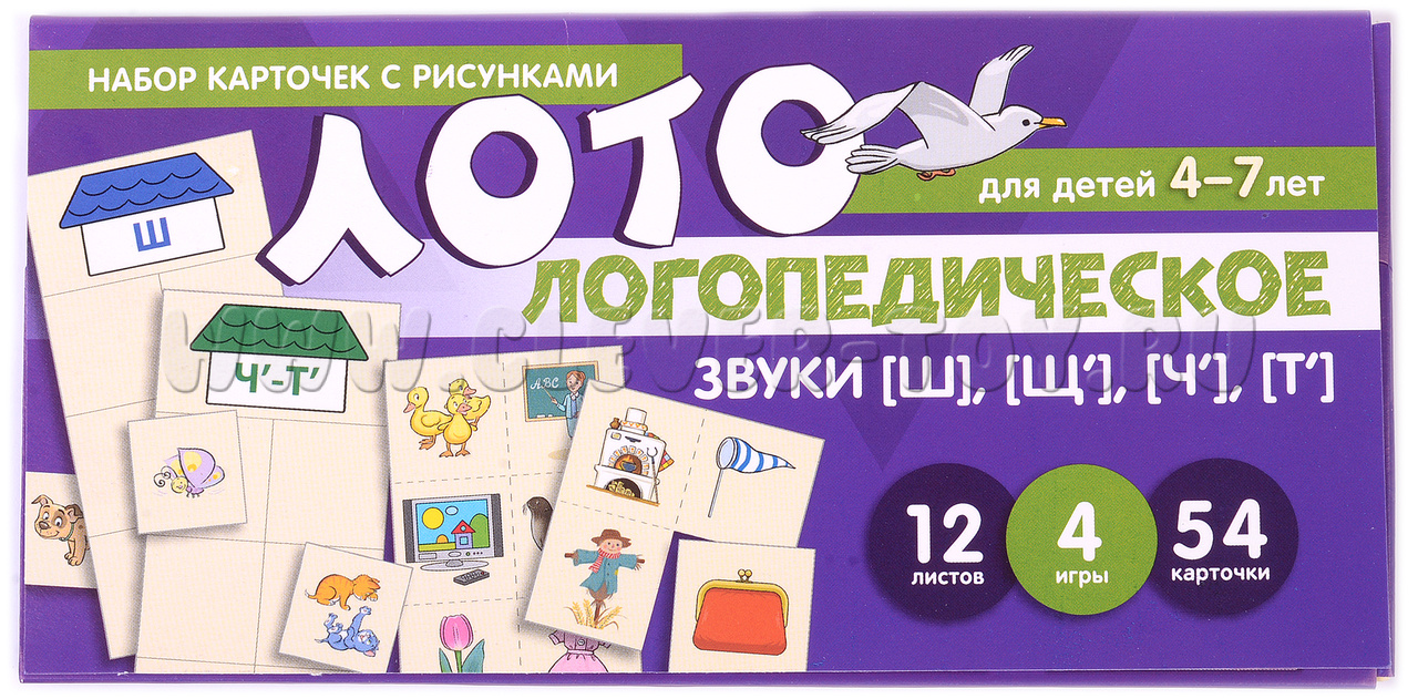 Комплект "Логопедическое лото. Учим звуки [Ш], [Щ'], [Ч'], [Т']" - это набор карточек для дошкольников и младших школьников. Он состоит из 12 листов с 54 карточками и 6 заданиями.