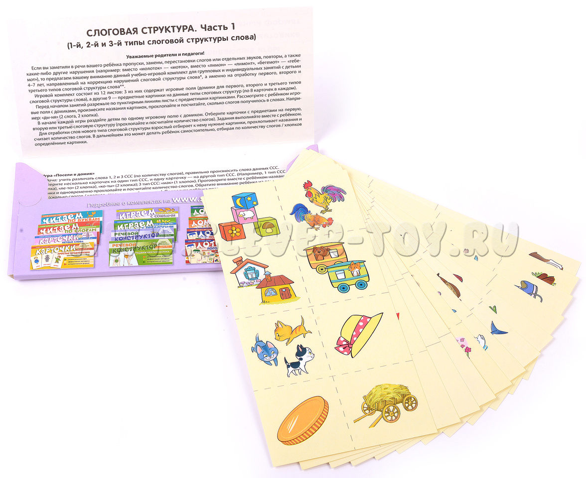 Комплект "Слоговая структура. Часть 1" - это 12 листов, наполненных 75 карточками и 4 увлекательными играми, разработанными специально для детей в возрасте от 4 до 7 лет. Задания в игровой форме помогут детям исправить нарушения слоговой структуры слова, включая работу с первым, вторым и третьим типами слоговой структуры.