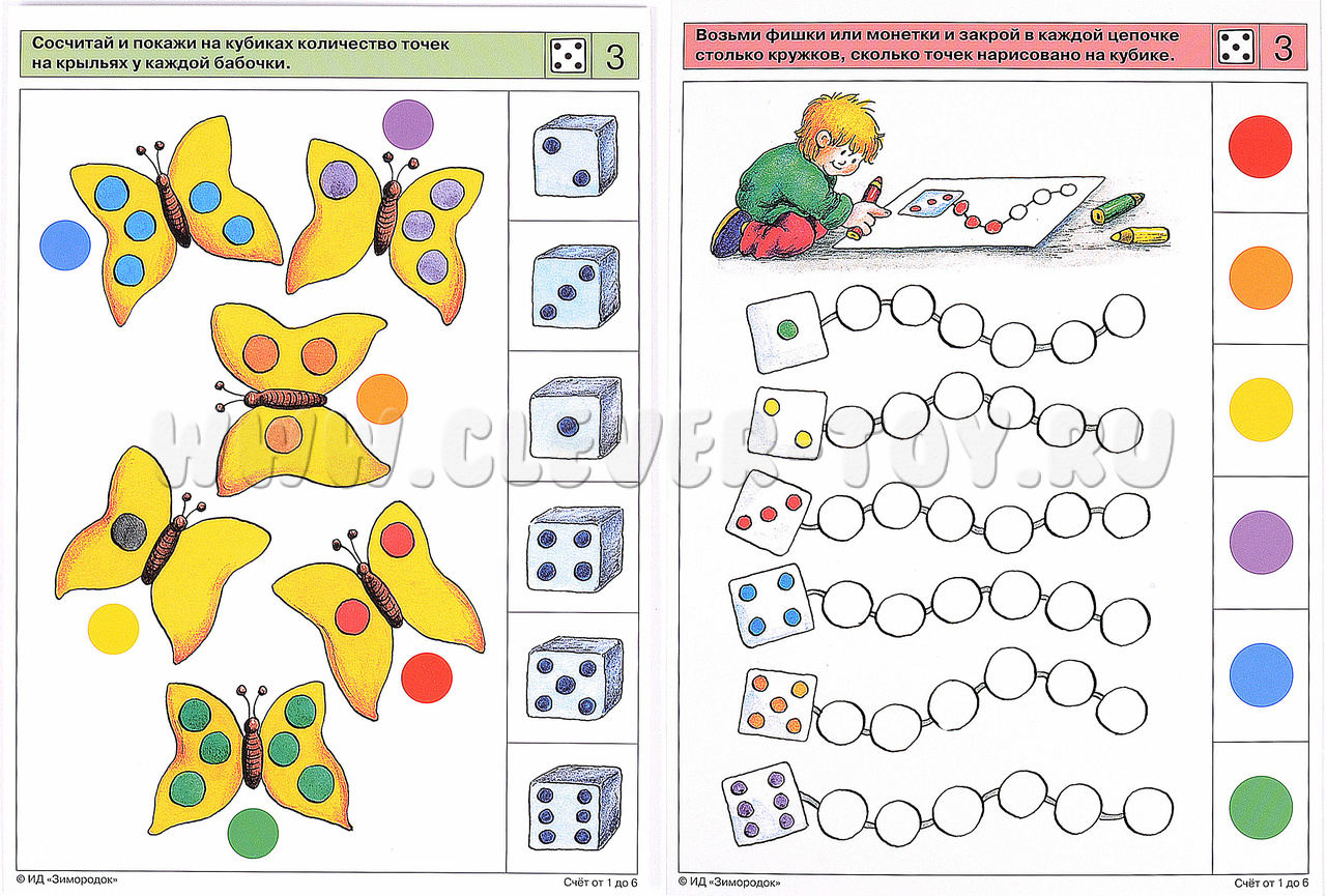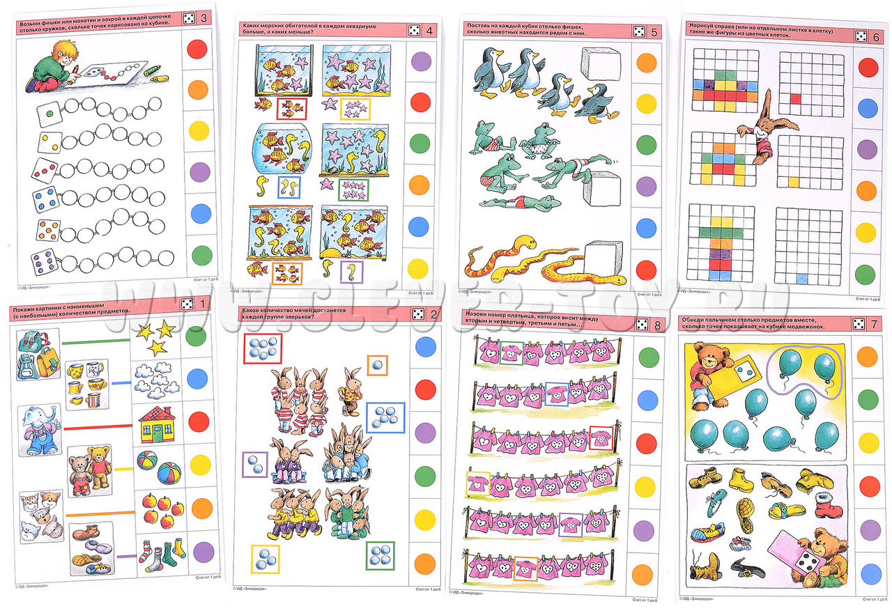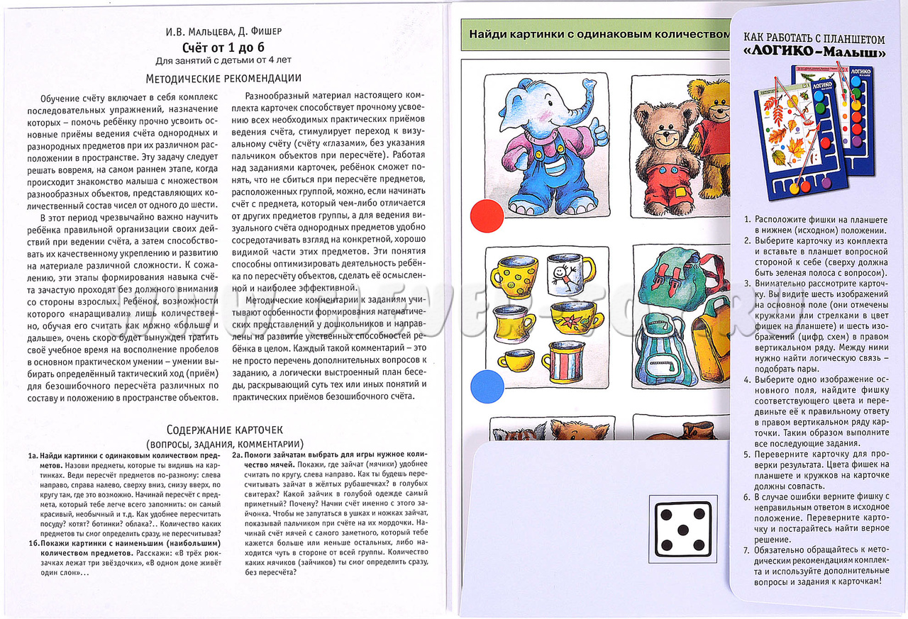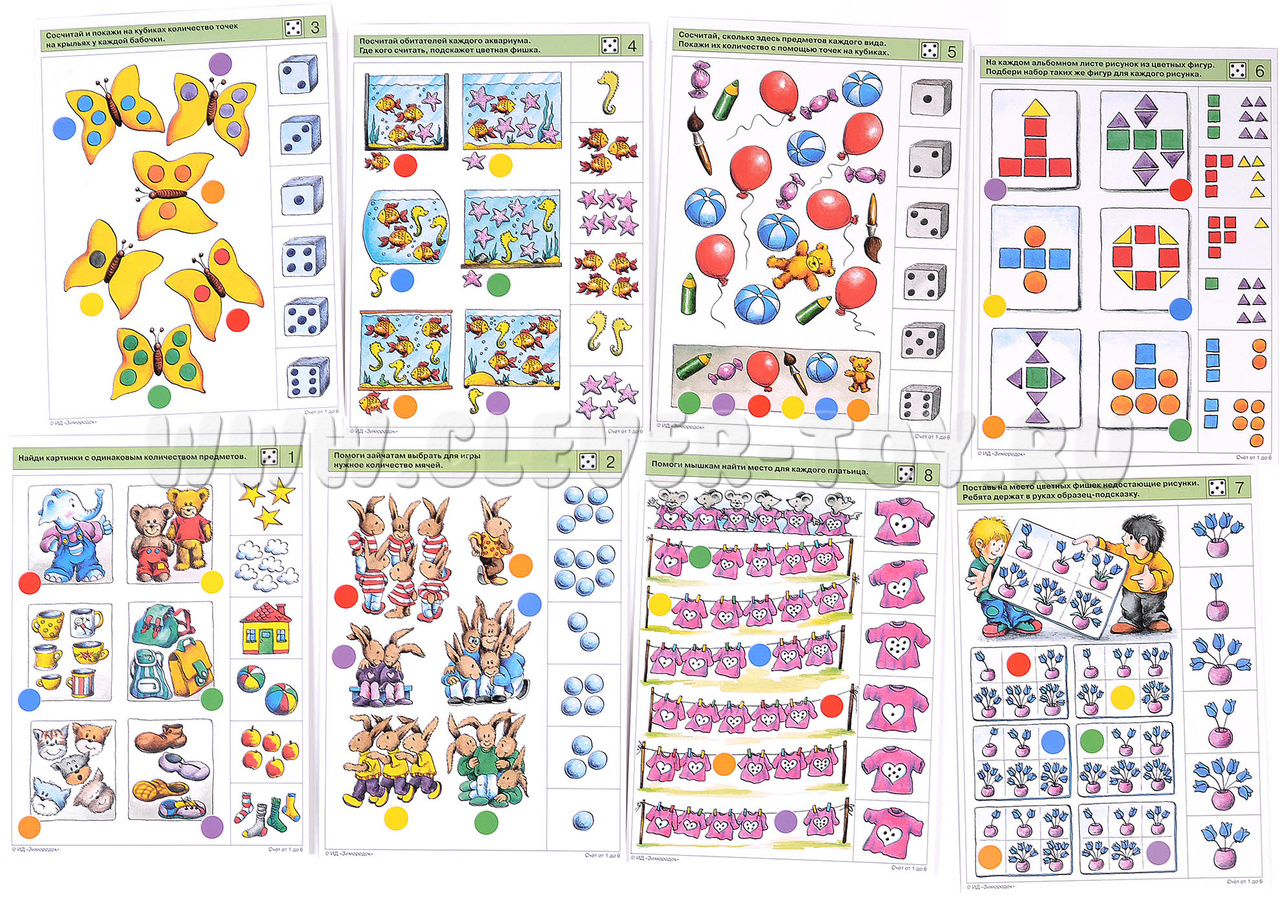 Материал настоящего комплекта карточек содержит последовательные упражнения, которые помогут ребёнку прочно усвоить основные приёмы ведения счёта однородных и разнородных предметов при их различном расположении в пространстве. Задания комплекта стимулируют переход к визуальному счёту (счёту «глазами», без указания пальчиком объектов при пересчёте). Примеры заданий в карточках: 1а. Найди картинки с одинаковым количеством предметов. 1б. Покажи картинки с наименьшим (наибольшим) количеством предметов. 2а. Помоги зайчатам выбрать для игры нужное количество мячей. 3а. Сосчитай и покажи на кубиках количество точек на крыльях у каждой бабочки. 4б. Каких морских обитателей в каждом аквариуме больше, а каких меньше?