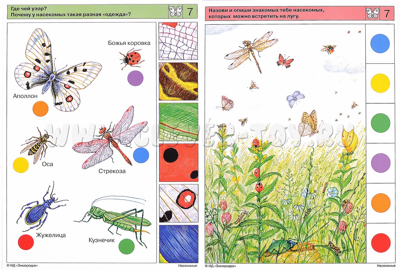 Комплект карточек знакомит ребёнка с наиболее древним и самым многочисленным по видовому разнообразию классом животных. Это всем хорошо известные бабочки, жуки, стрекозы, кузнечики, пчёлы, комары, мухи, тараканы и многие другие. Решая задания, ребёнок будет не только узнавать новых и называть уже хорошо известных ему насекомых, но и выстраивать этапы их развития, сортировать по видам. Примеры заданий в карточках: 1б. Узнай насекомых по силуэтам и назови. 2б. Расскажи, как развивается жук: что сначала, что потом? За. Узнай бабочек по контурам крыльев. 5б. Кто здесь насекомые, а кто нет? По каким признакам ты угадал? 6а. Отгадай, кто, где и как маскируется?