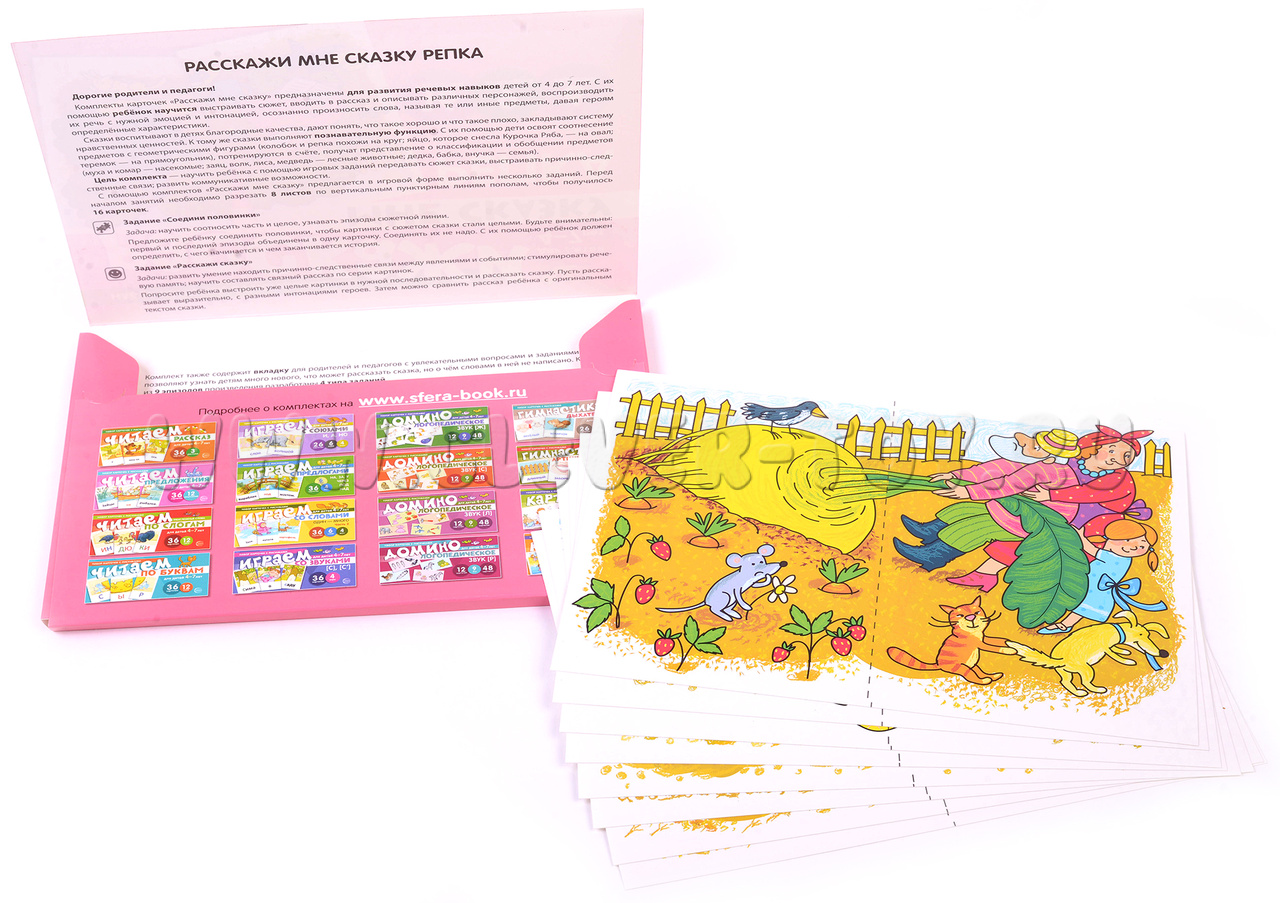 Комплект карточек "Расскажи мне сказку РЕПКА" представляет собой 8 разрезных листов и вкладку с заданиями и вопросами для детей, адресованную родителям и педагогам. Он дарит возможность собрать и выстроить сюжет хорошо известной ребёнку сказки, рассказать и показать её, выполняя разнообразные интересные задания. Учебно-игровой комплект научит детей: - сравнивать и сопоставлять слова, предметы, ситуации; - ставить себя на место персонажей; - выражать чувства и эмоции с помощью телодвижений; - использовать в речи различные по смыслу и стилю слова; - подходить к построению рассказа творчески и с воображением. Желаем увлекательных занятий!