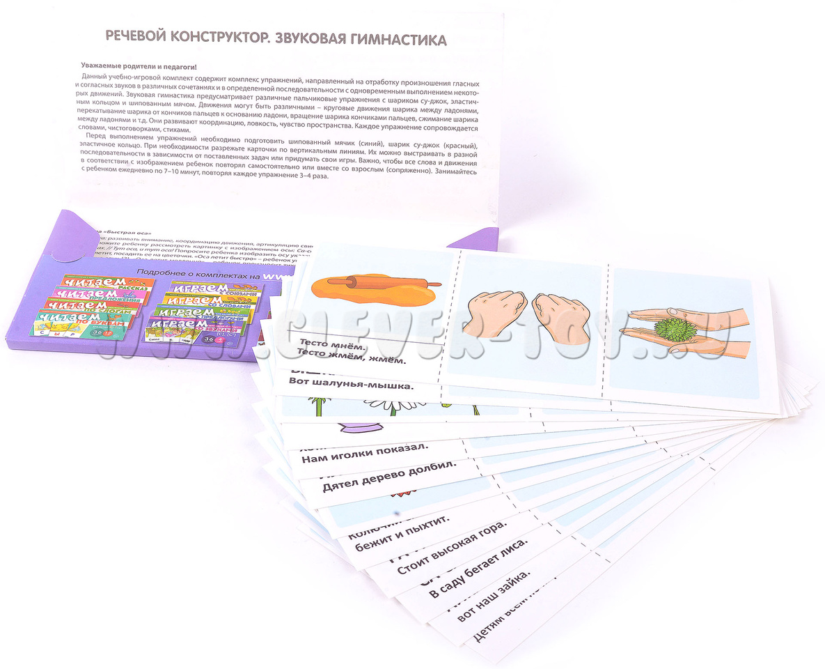 Комплект "Речевой конструктор. Звуковая гимнастика" представляет собой 12 листов, состоящих из 36 карточек и 4 игр. Ребенок научится совершать пространственные действия, произнося одновременно звуки, слоги, слова, а также воспроизводить цепочки движений, развивая моторные навыки, зрительное восприятие и слухомоторную память.