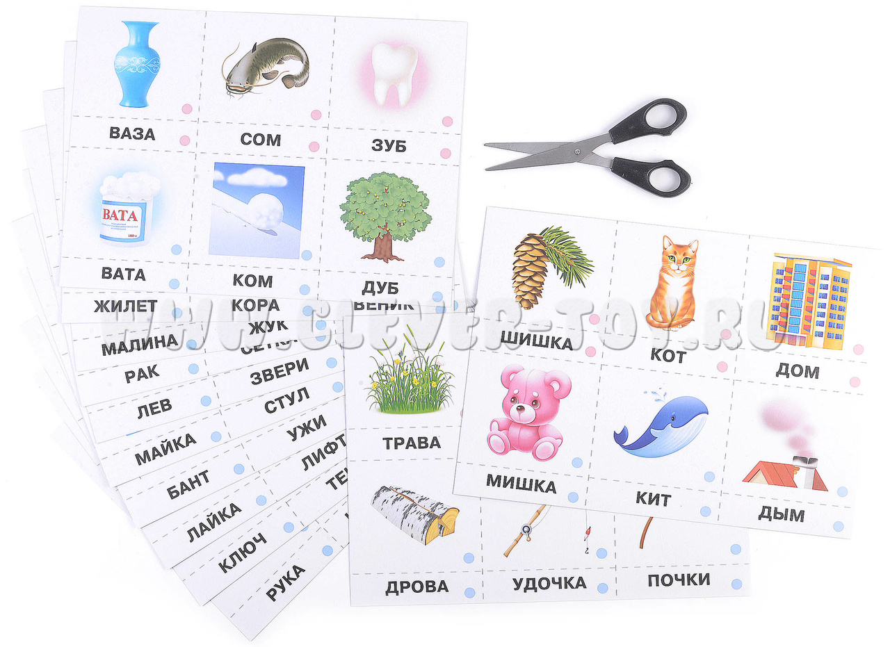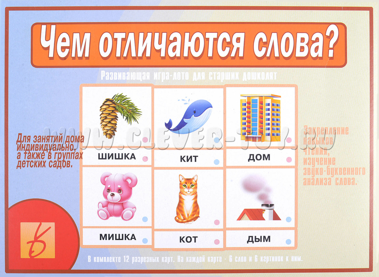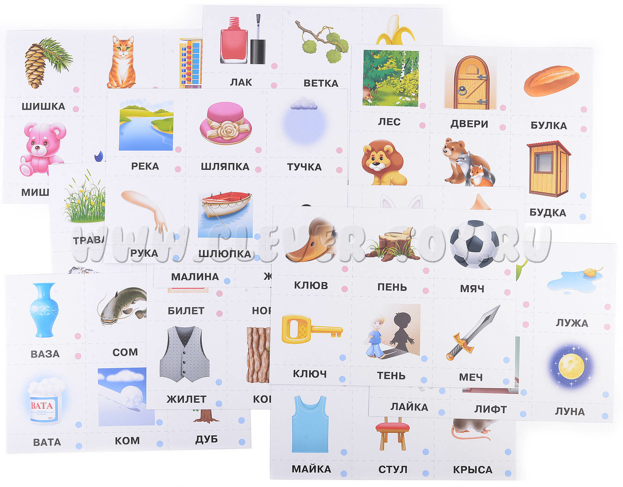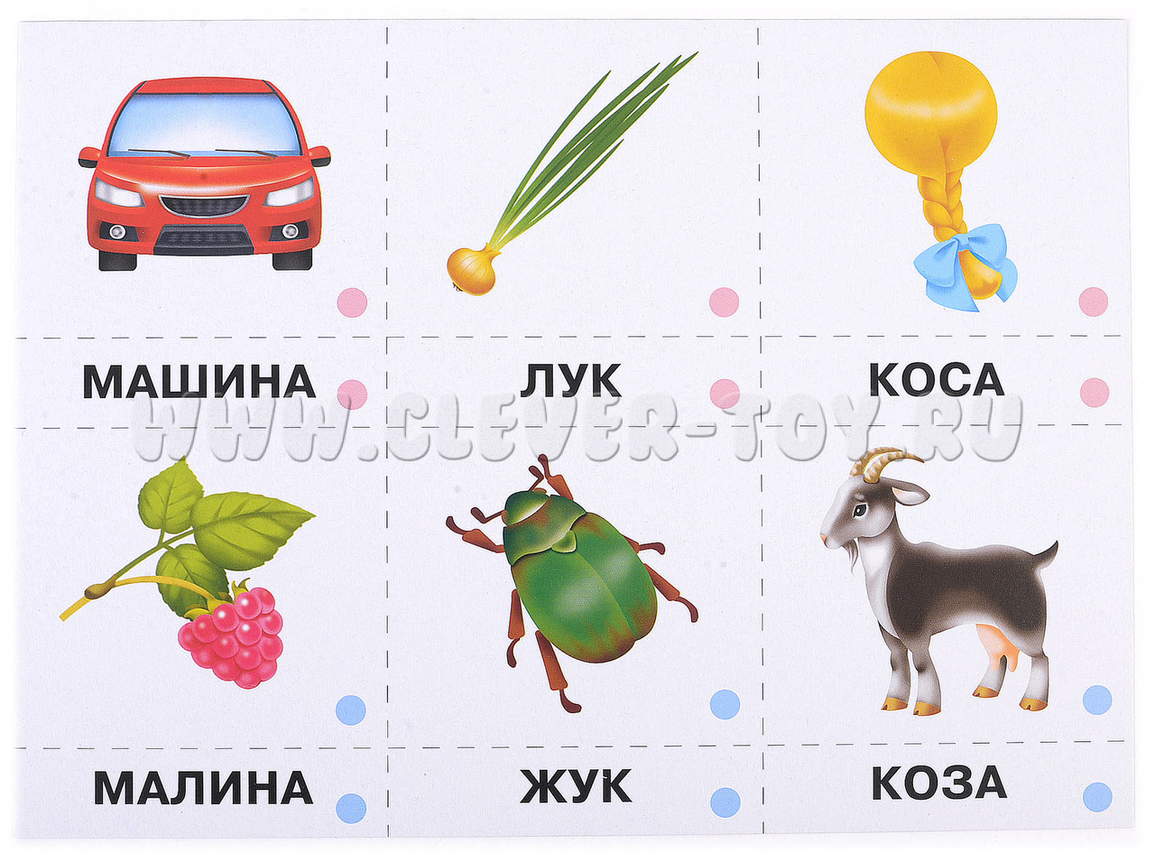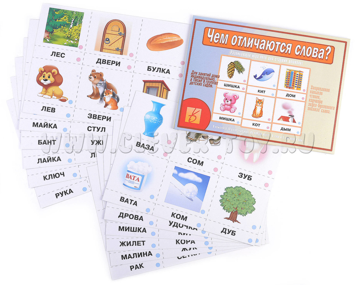 1. Раздайте детям карточки с картинками, которые отмечены красными точками. Ребята должны подобрать к ним сначала слова, а затем карточки с картинками, помеченные синими точками, так, чтобы названия отличались только одной буквой. Дети должны объяснить, какими буквами отличаются слова. Выиграет тот, кто соберёт свои карточки быстрее других и правильно расскажет, чем отличаются слова.