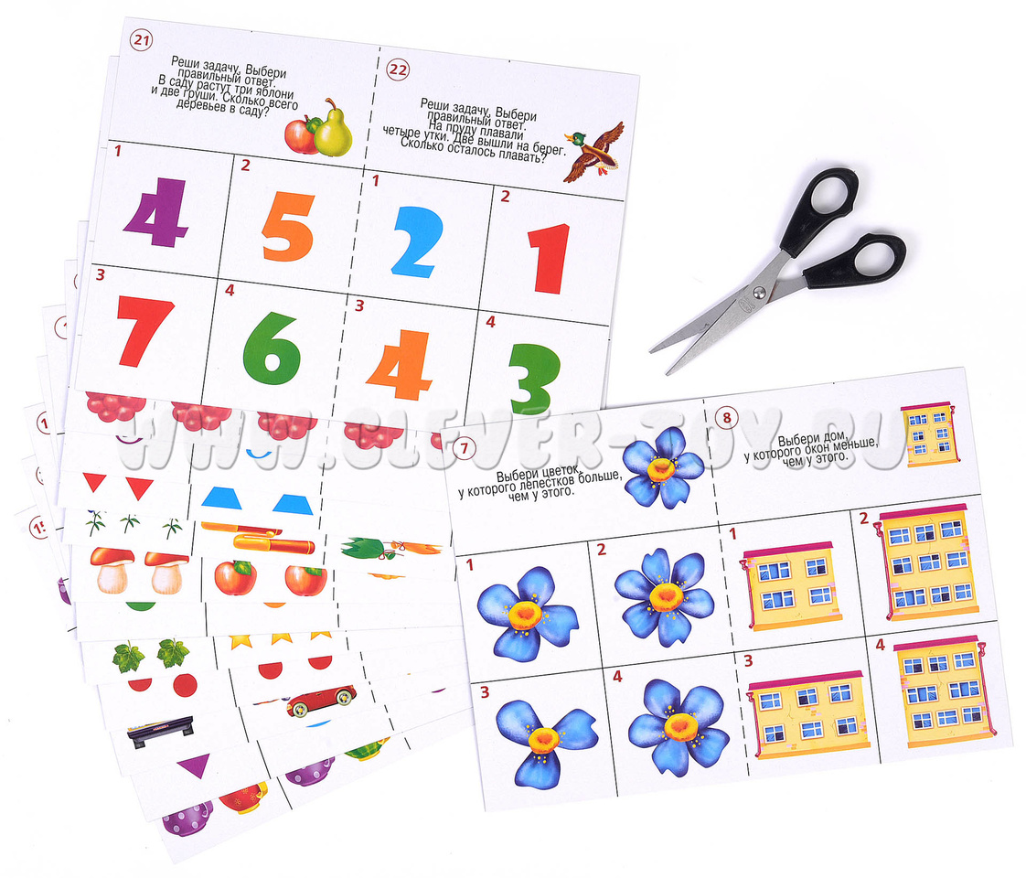 Тестовые задания для проверки знаний по математике перед поступлением в школу. Перед началом занятий требуется разрезать карты по пунктирным линиям (получится 24 карточки с заданиями и 24 с картинками).