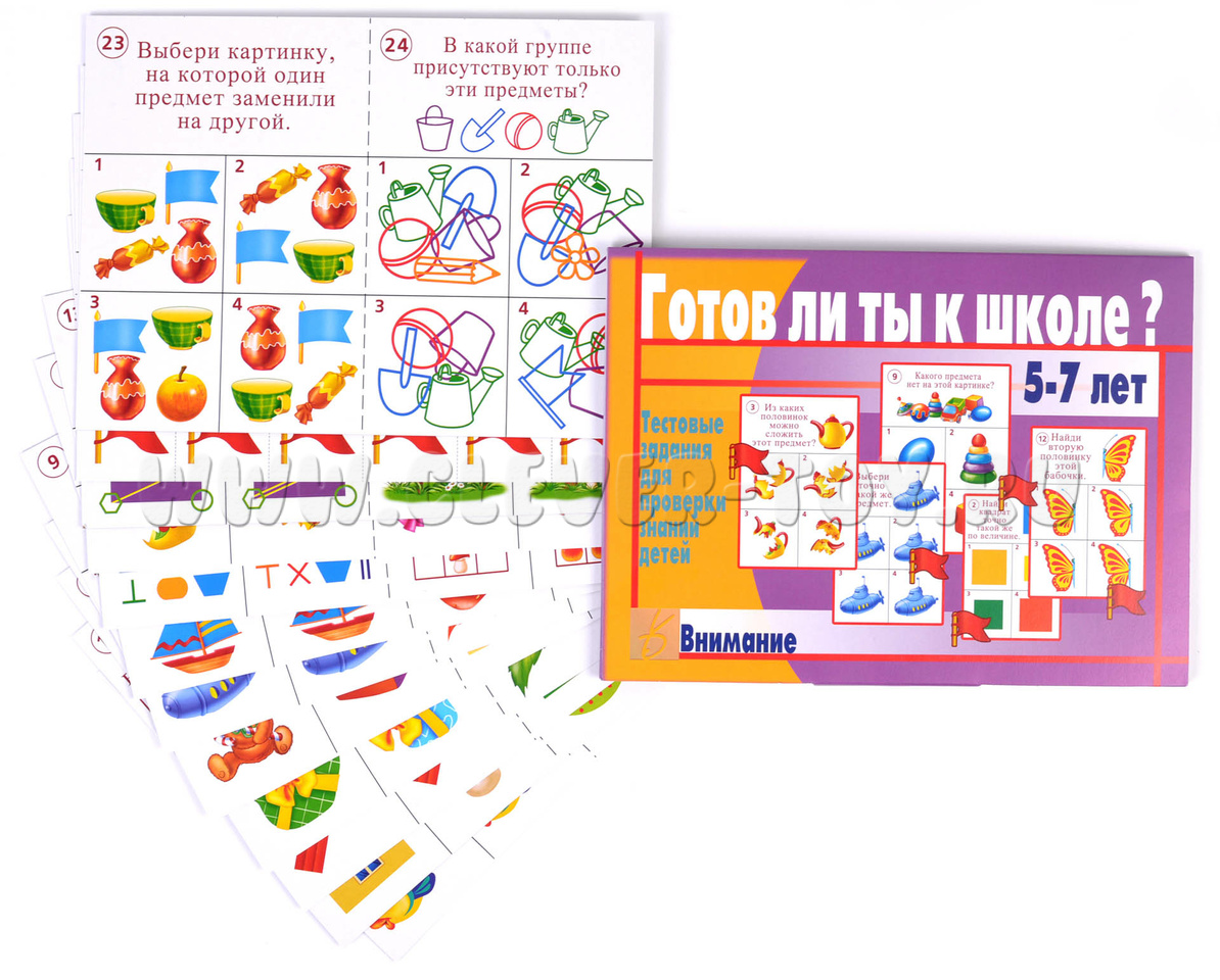Тестовые задания для проверки знаний детей "Готов ли ты к школе? Внимание" – контрольно-измерительный материал, который проверит уровень развития внимания вашего ребенка и подготовит его к началу учебы в школе. Игра выполнена в формате картонных карточек А4 и содержит в себе тестовые задания, разделенные пунктирной линией на отдельные карточки. Каждое задание сопровождается и 4 иллюстрированными вариантами ответа – это поможет ребенку быстрее и легче усвоить материал.