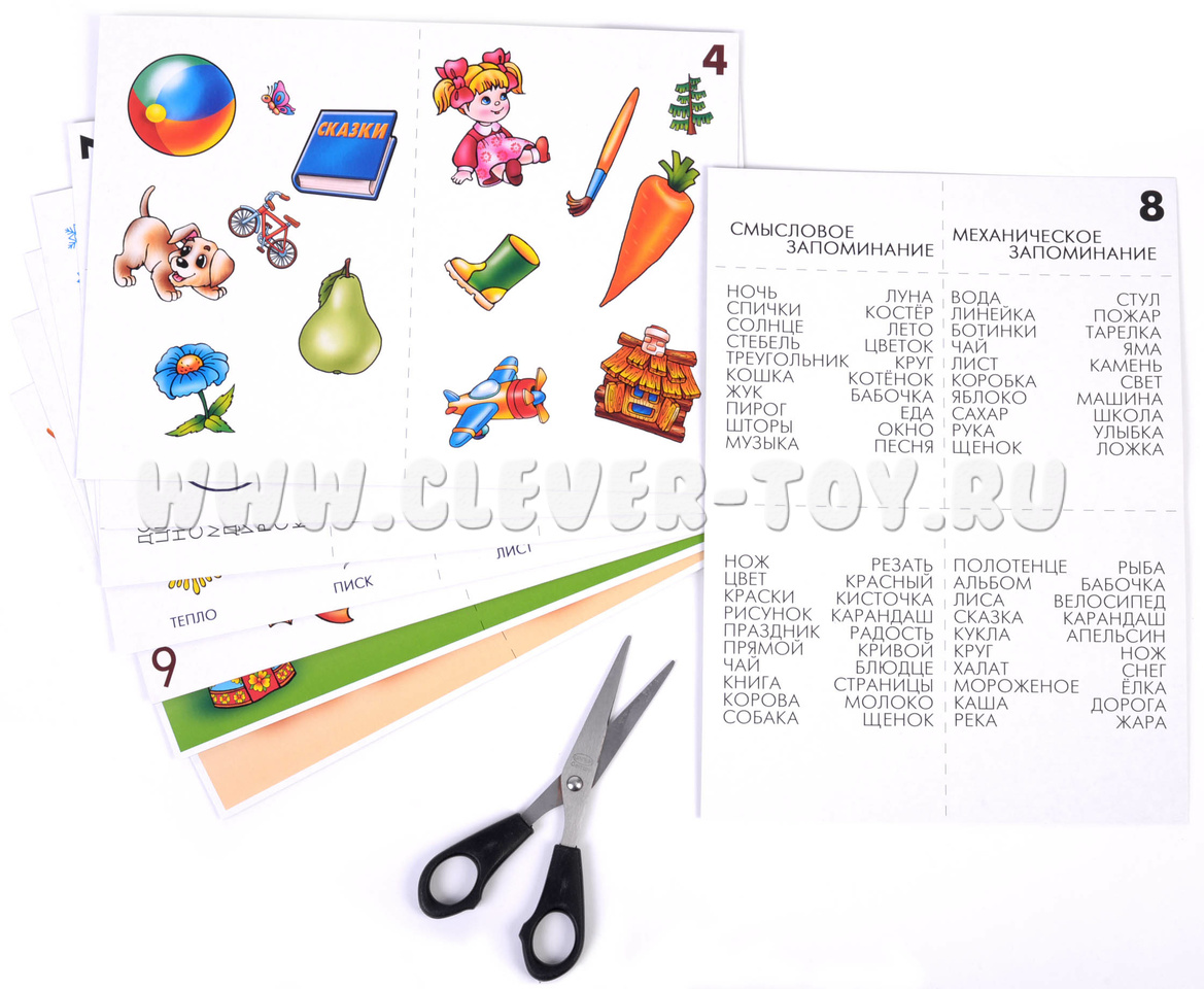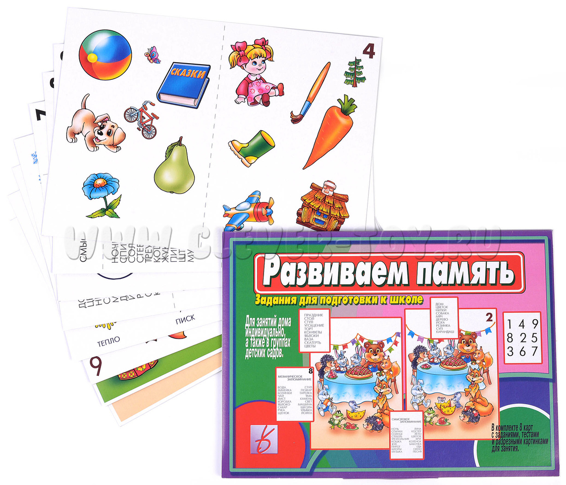 В комплекте удобная папка для хранения и 8 карт с заданиями, каждое на отдельном листе. Все задания направлены на запоминание и воспроизведение полученной информации (зрительные и отвлеченные образы, связь между запоминаемым словом и опорной картинкой и т.д.). Рекомендуются ежедневные занятия длительностью не более 15-20 минут.