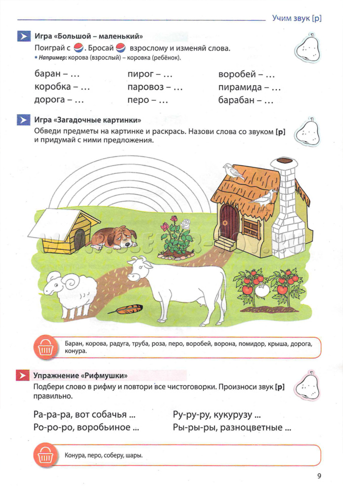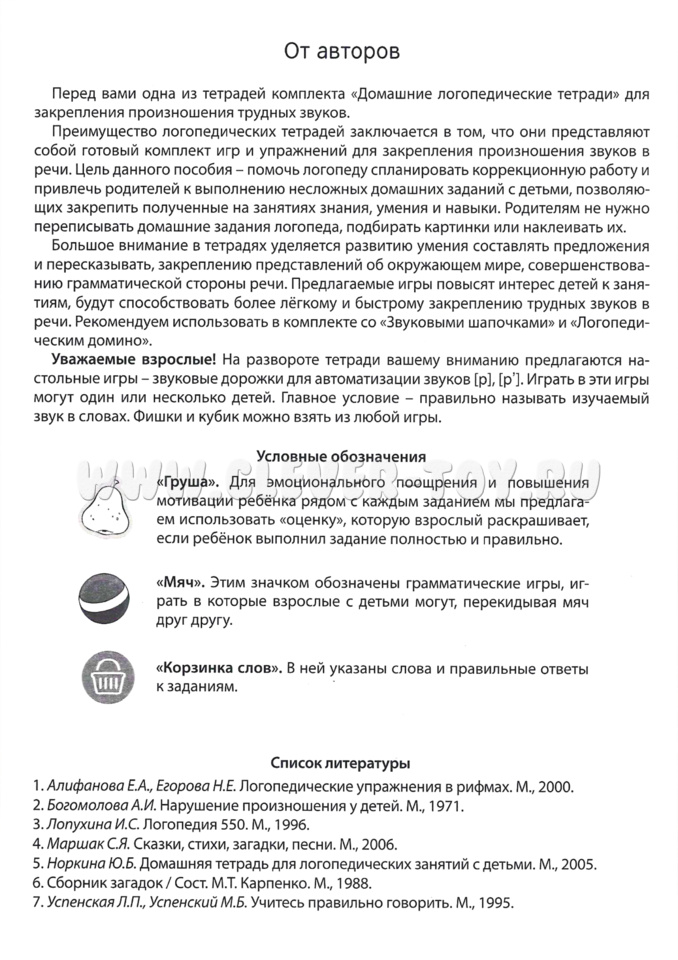 Так же для удобства в теради есть условные обозначения: "Груша". Для эмоционального поощрения и повышения мотивации ребёнка рядом с каждым заданием мы предлагаем использовать "оценку", которую взрослый раскрашивает, если ребёнок выполнил задание полностью и правильно. "Мяч". Этим значком обозначены грамматические игры, играть в которые взрослые с детьми могут, перекидывая мяч друг другу. "Корзинка слов". В ней указаны слова и правильные ответы к заданиям.