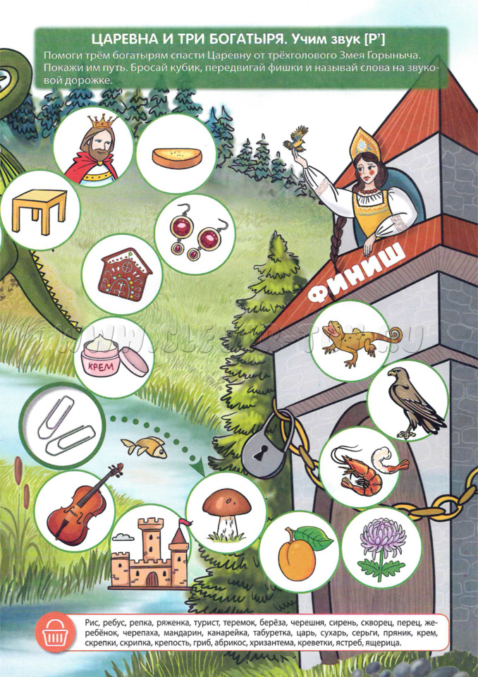 На развороте тетради предлагаются настольные игры (Путешествие в эру динозавров; Царевна и три богатыря)- звуковые дорожки для автоматизации звуков [р], [р']. Играть в эти игры могут один или несколько детей. Главное условие - правильно называть изучаемый звук в словах. Фишки и кубик можно взять из любой игры.